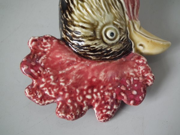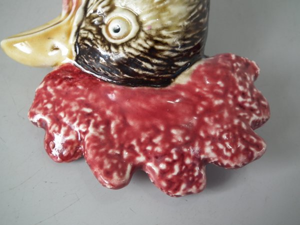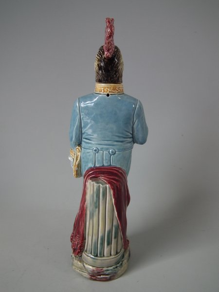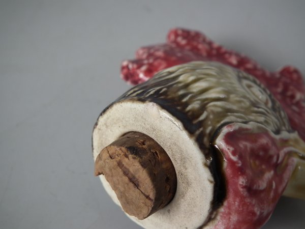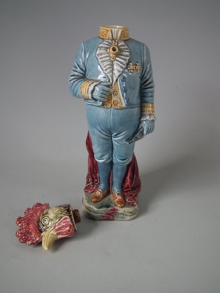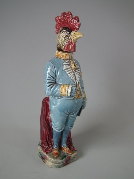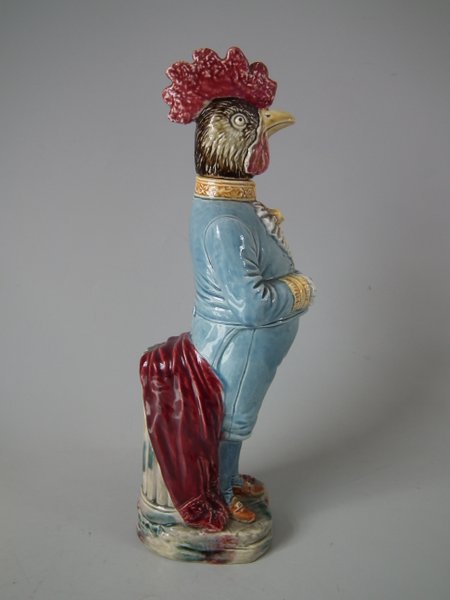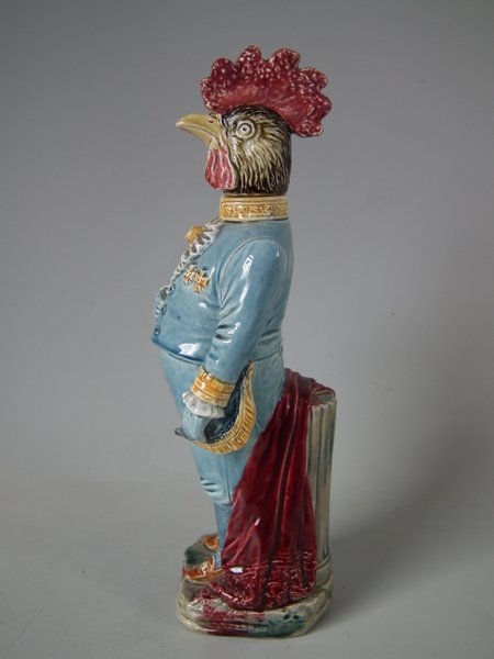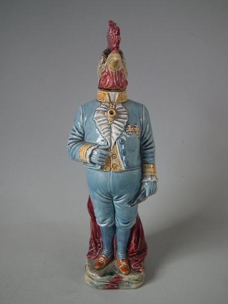 Circa 1890. 13ins high, 4.3ins wide, 4.5ins depth. B & L Majolica figural bottle which features a cockerel in uniform - the brooch forms the pouring spout and the cockerels removable head forms the lid.