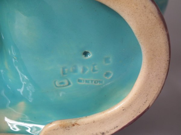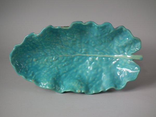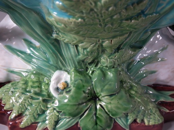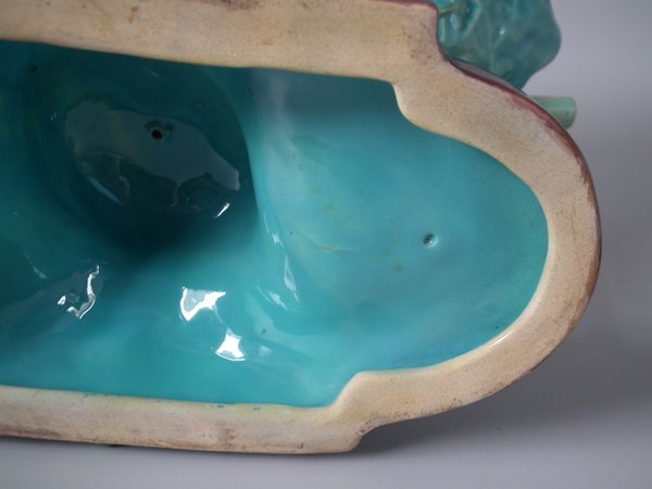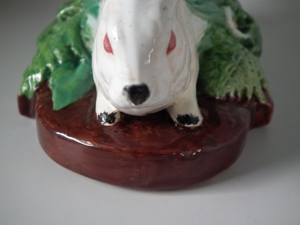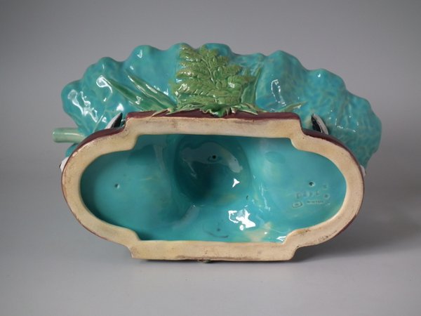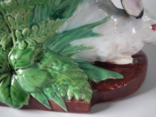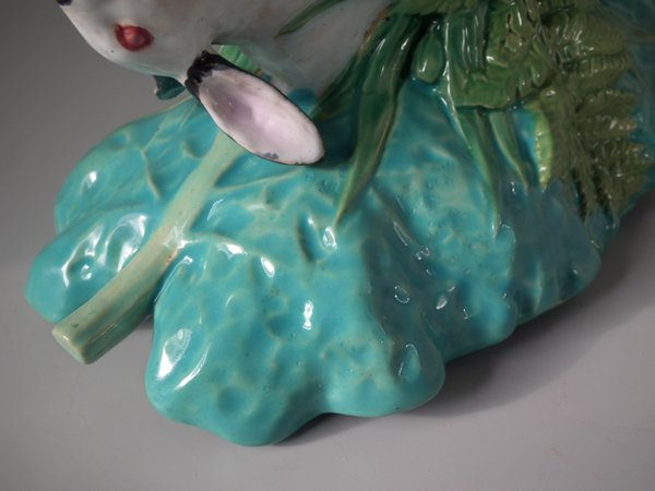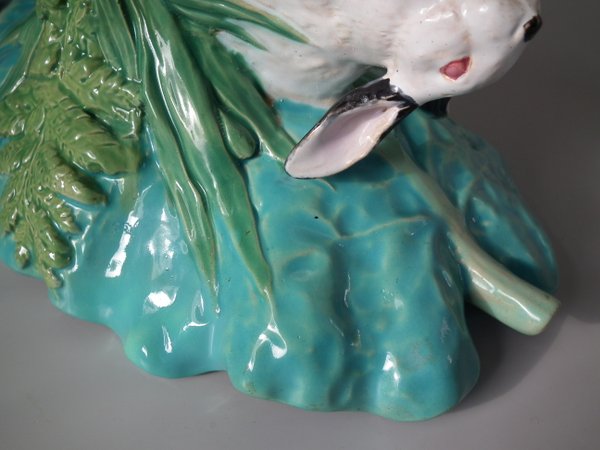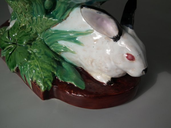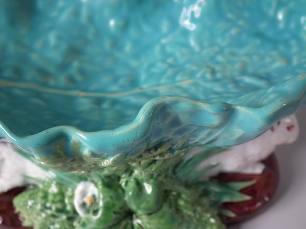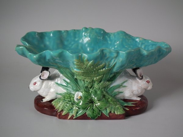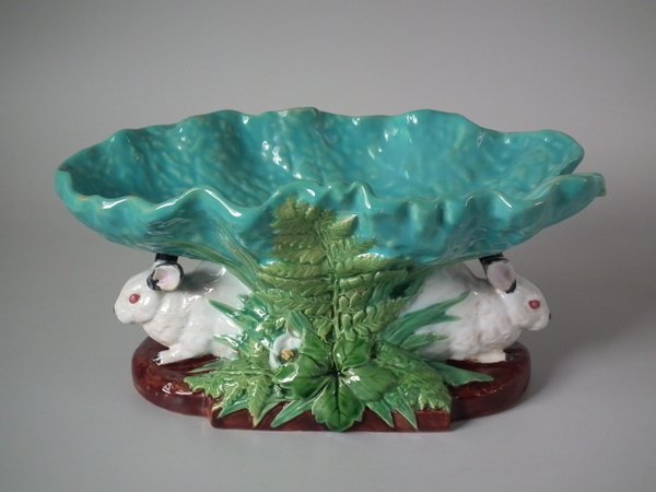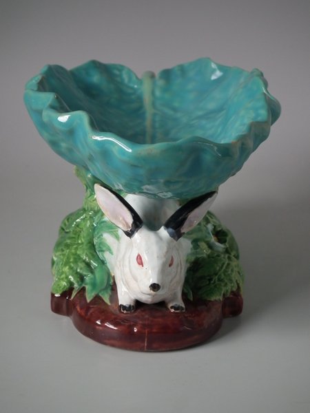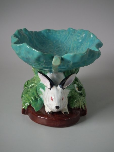 Victorian, circa 1869. 4.7ins high, 9.6ins wide, 5.3ins depth. Minton Majolica compote which features two rabbits supporting a cabbage leaf.
