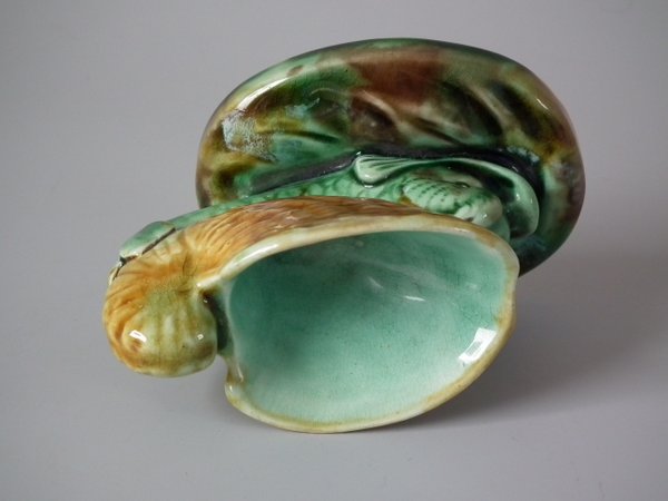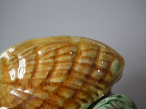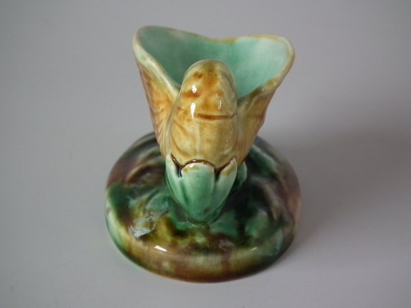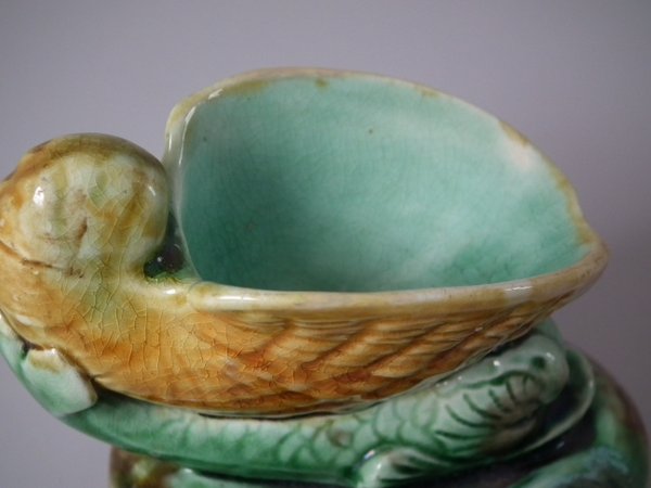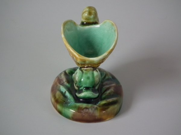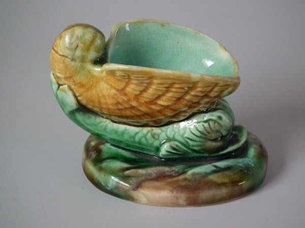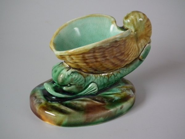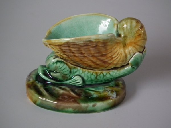 Wedgwood Majolica salt which features a dolphin supporting a shell on its back.
