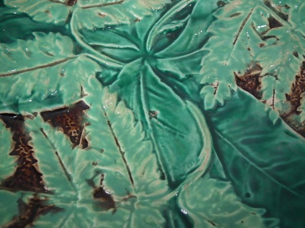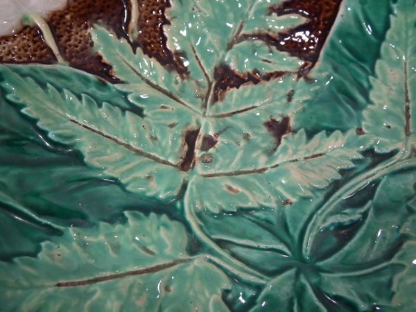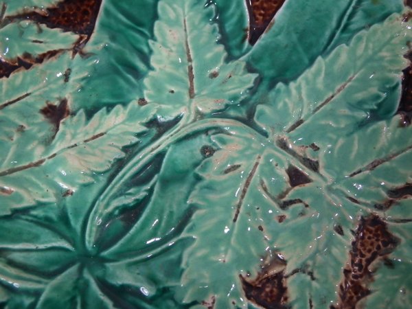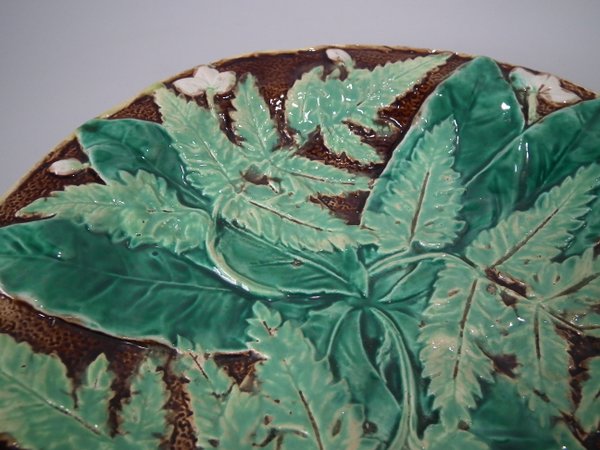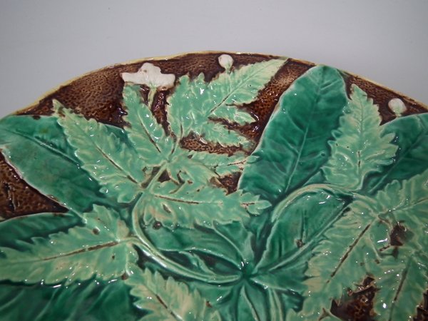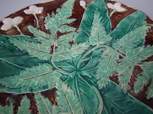 Victorian, circa 1870. 8.5ins high, 8.5ins wide, 1.2ins depth. Majolica plate which features fern leaves and flowers. Brown ground version.