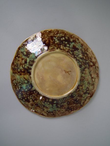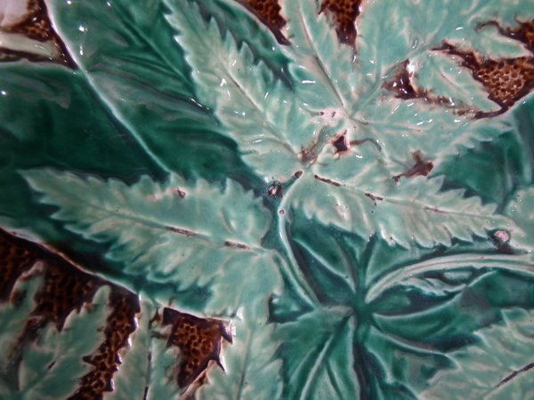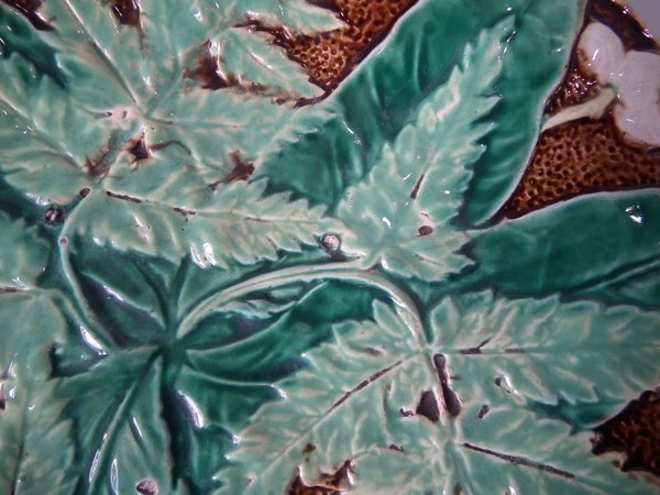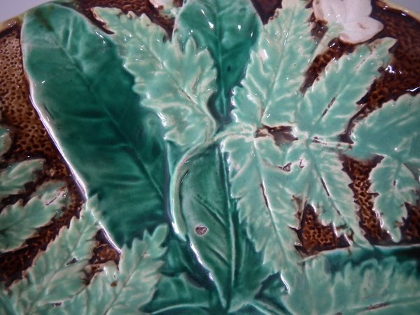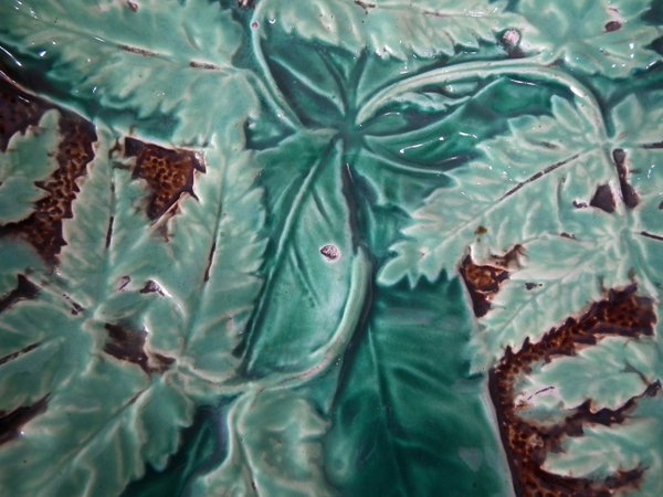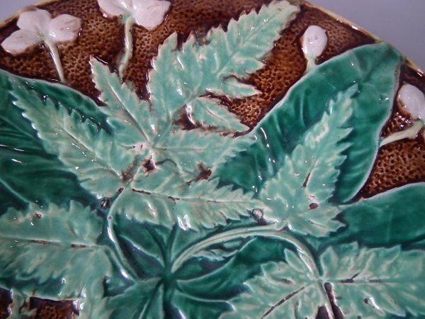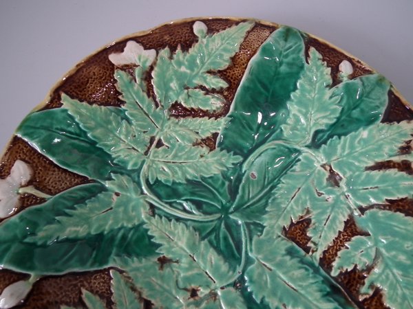 Victorian, circa 1880. 8.5ins high, 8.5ins wide, 1.2ins depth. Majolica plate which features fern leaves and flowers. Brown ground version.