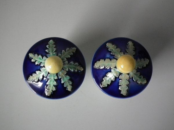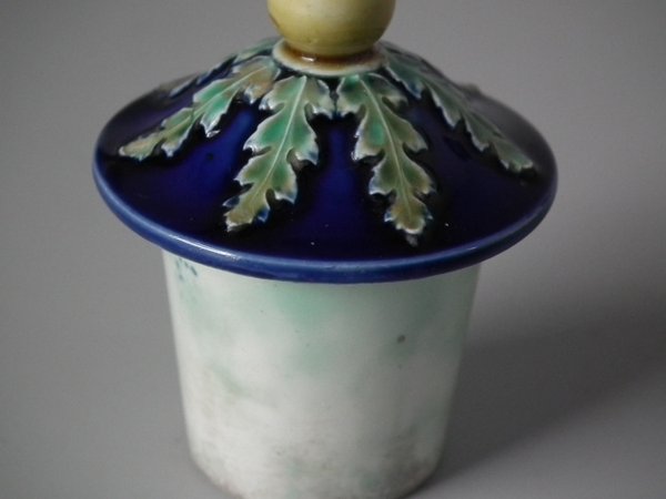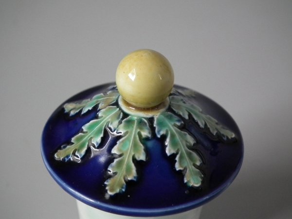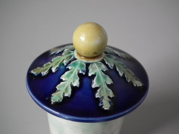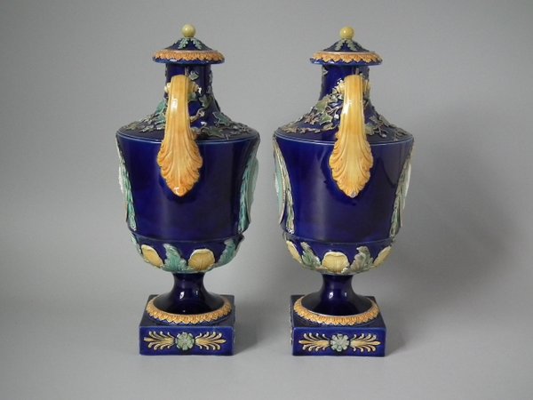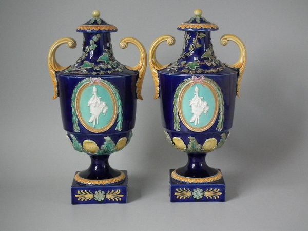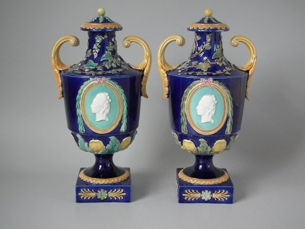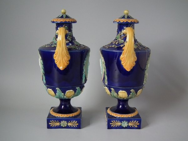 Victorian, circa 1870. 14.8ins high, 5.7ins wide, 4.7ins depth. Wedgwood Majolica urn which features a decorative panel on either side.
