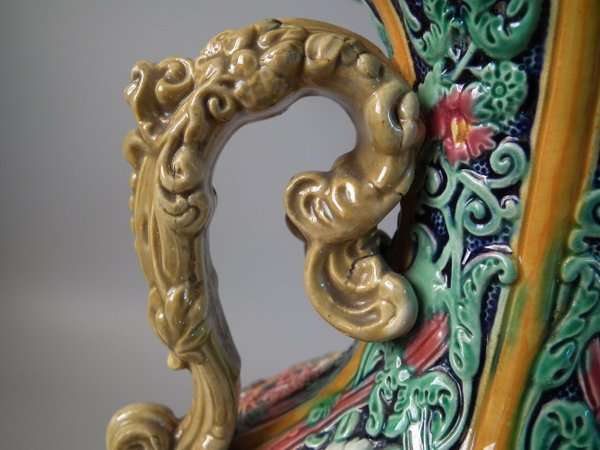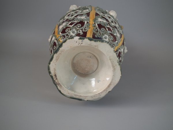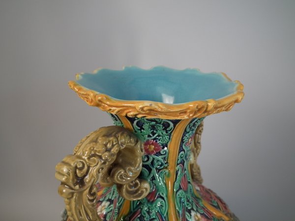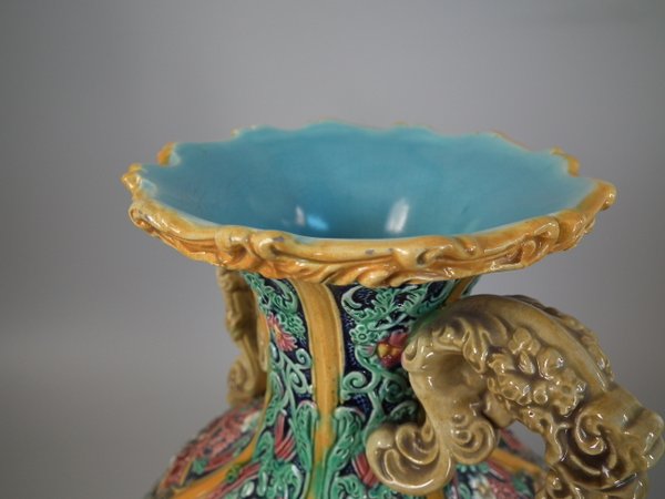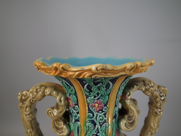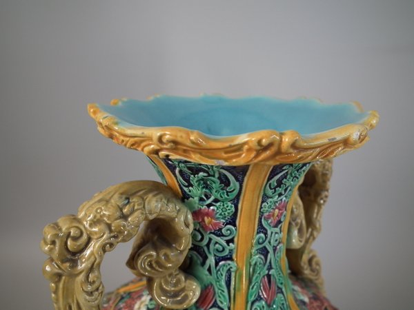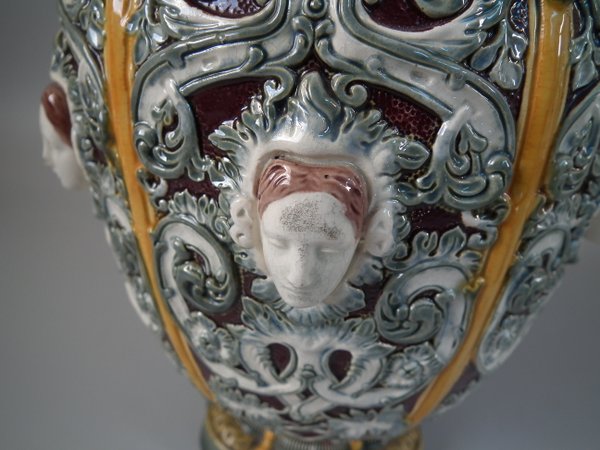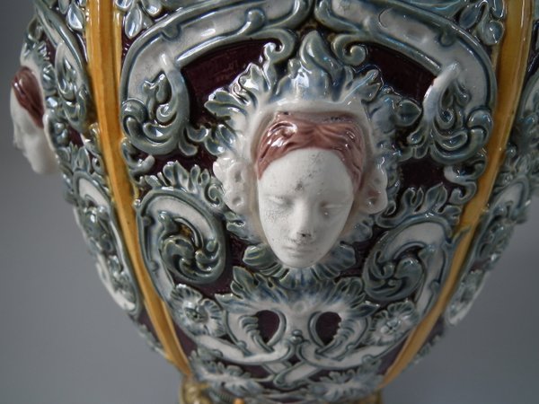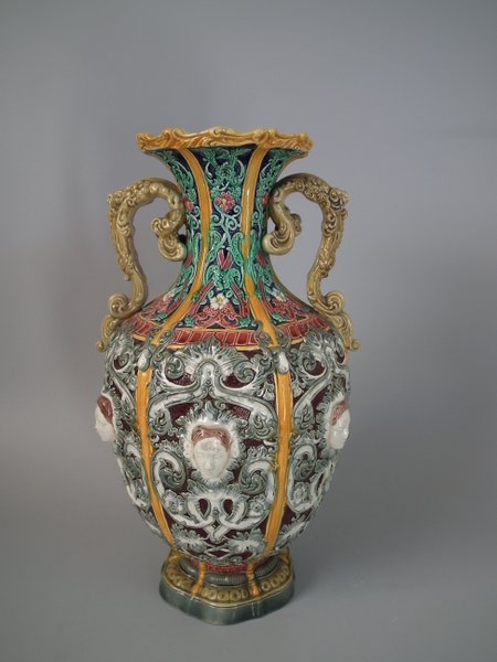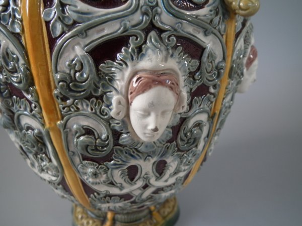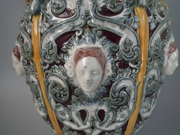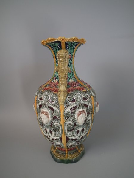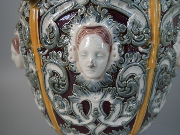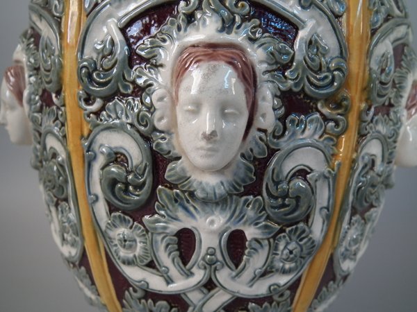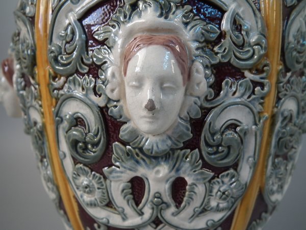 Victorian, circa 1870. 12ins high, 6.7ins wide, 6.3ins depth. Copeland Majolica vase which features six stylised foliate panels divided by ochre strapwork, each with a female mask molded in the centre.