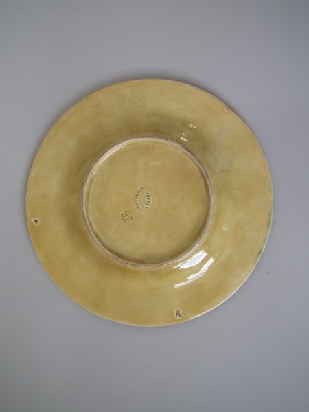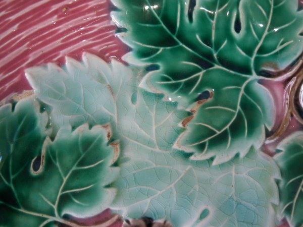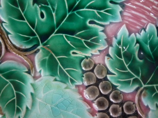 Victorian, circa 1880. 9.1ins high, 9.1ins wide, 1.2ins depth. Boch Freres Kermis Majolica plate which features grapes and vines. Colouration: pink, green, brown, are predominant.