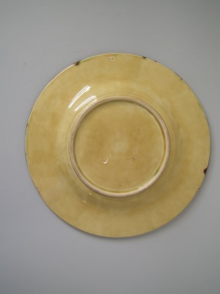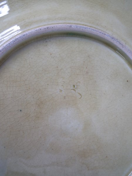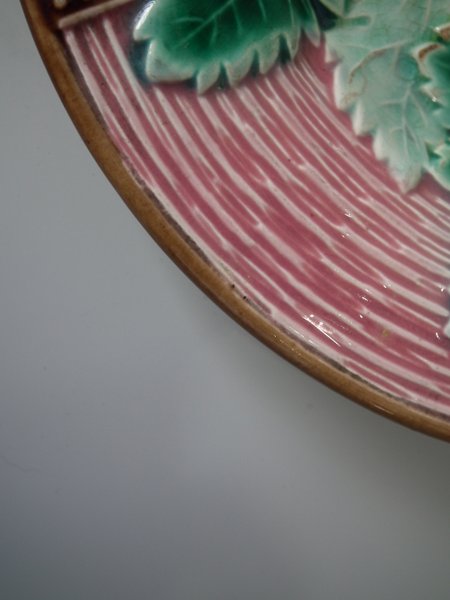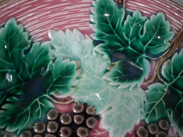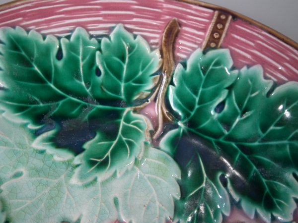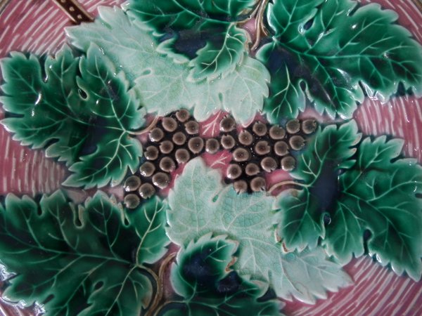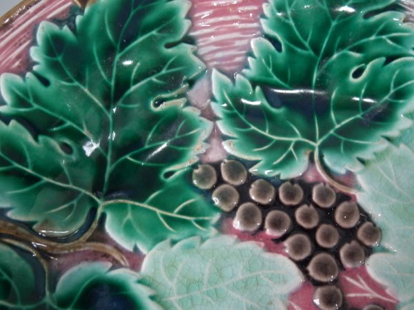 Victorian, circa 1880. 9.1ins high, 9.1ins wide, 1ins depth. Boch Freres Kermis Majolica plate which features grapes and vines. Colouration: pink, green, brown, are predominant.