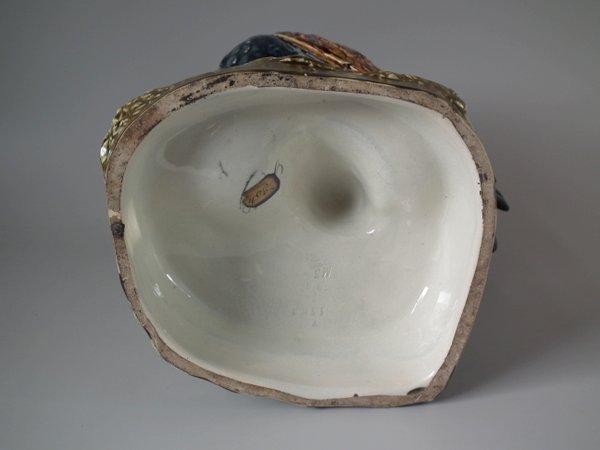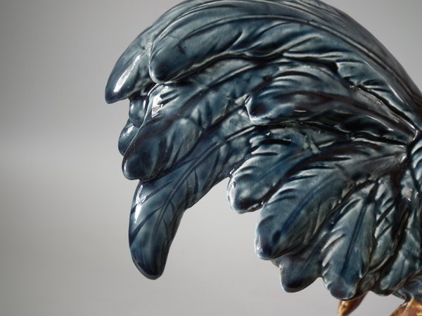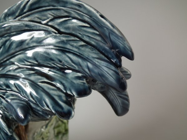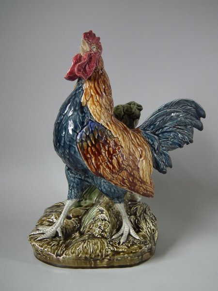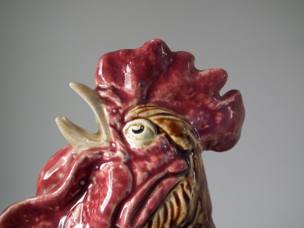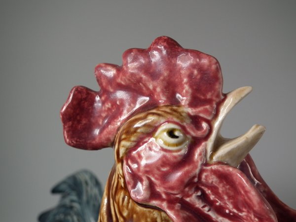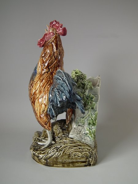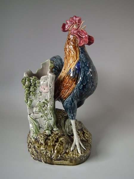 Circa 1880. 14.6ins high, 12.2ins wide, 6.9ins depth. Choisy Majolica vase which features a rooster stood in front of a stone wall.
