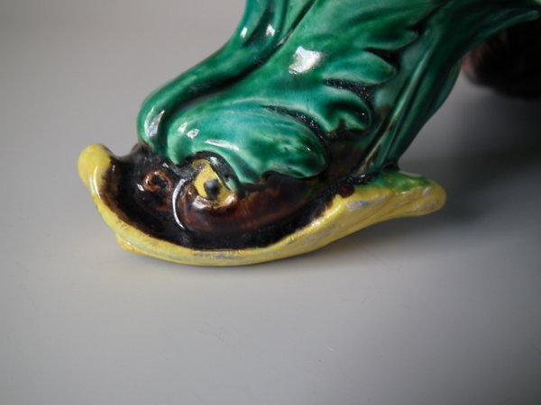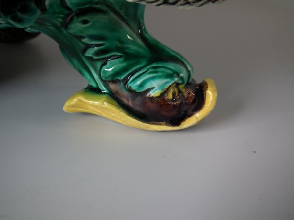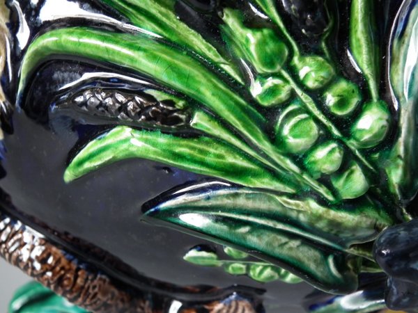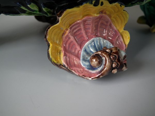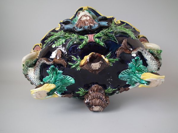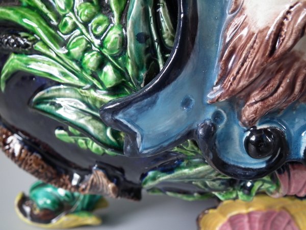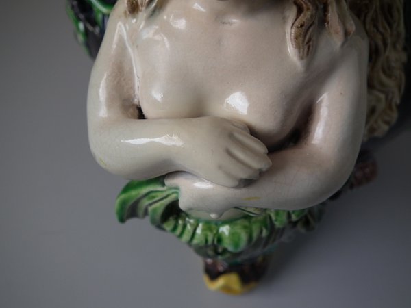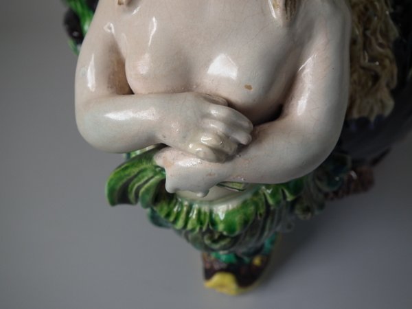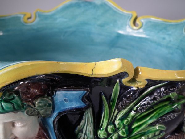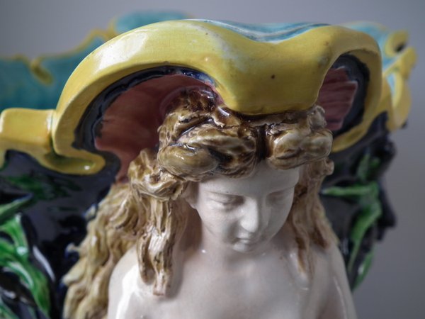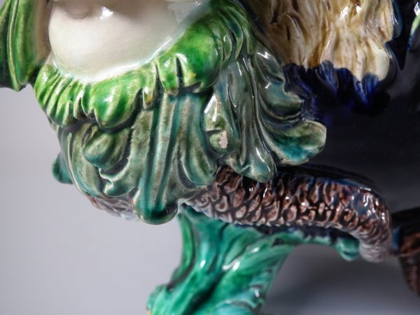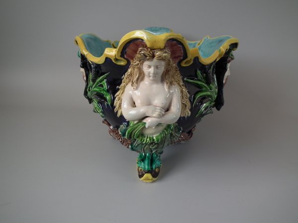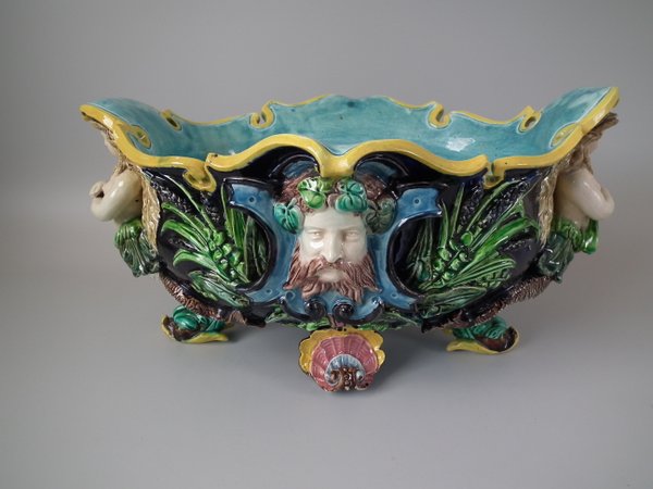 Victorian, circa 1870. 8.7ins high, 15.7ins wide, 11.4ins depth. Lonitz Majolica planter which features mermaids to both ends and face of Poseidon to front and back.