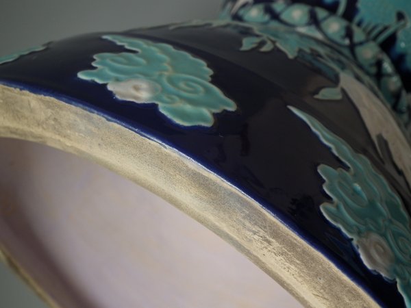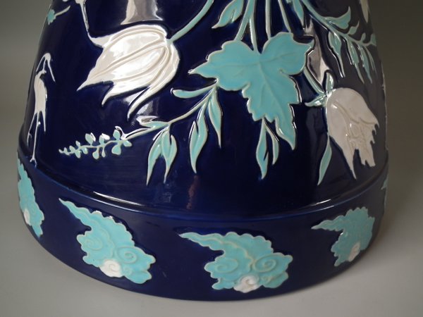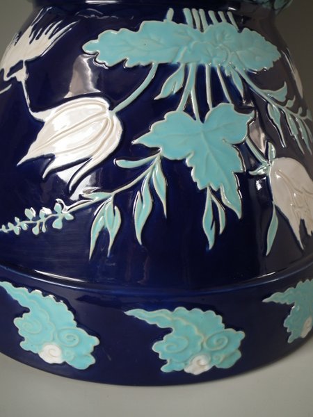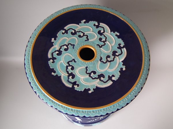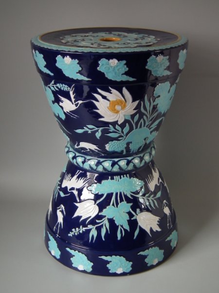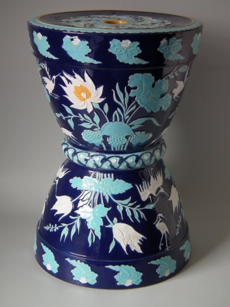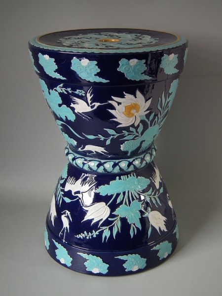 Victorian, circa 1866. 18.1ins high, 12.4ins wide, 12.4ins depth. Minton Majolica garden seat which features storks with oriental flowers and patterns.