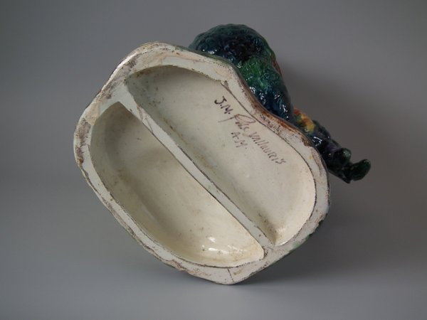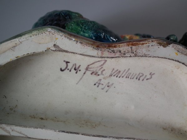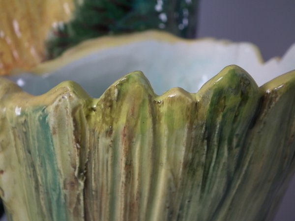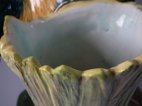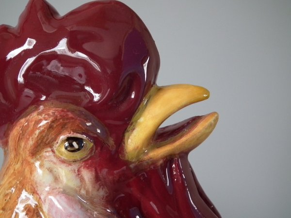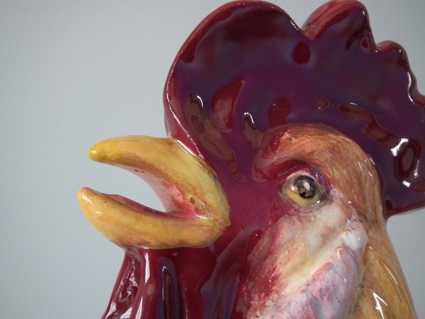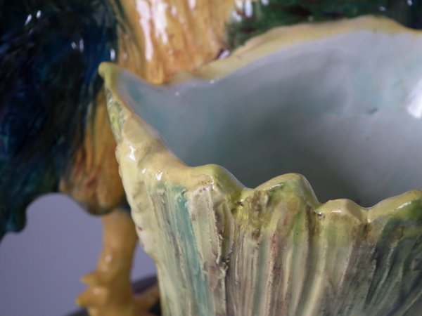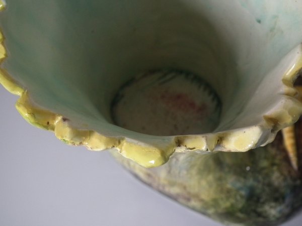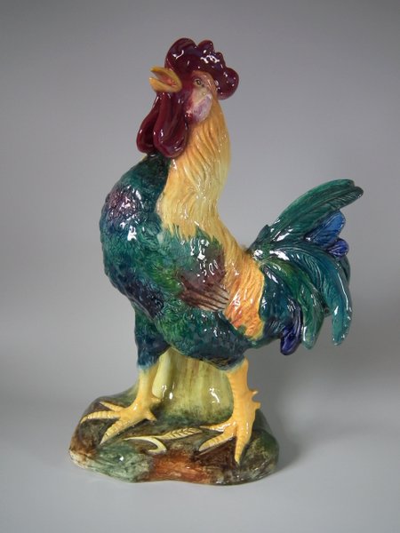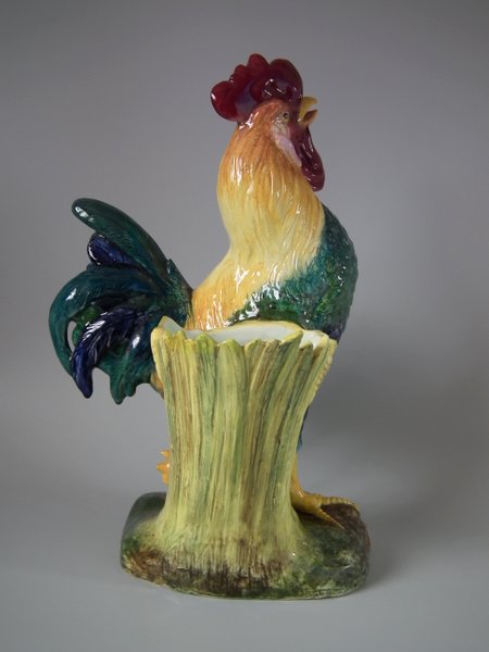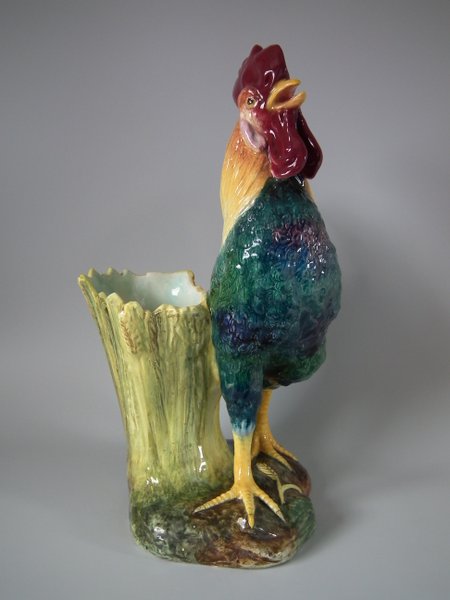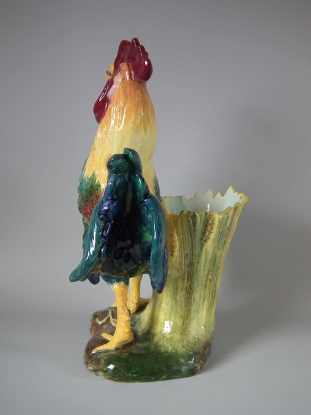 Circa 1900. 18.5ins high, 11.4ins wide, 7.9ins depth. Jerome Massier Majolica vase which features a cockerel/rooster