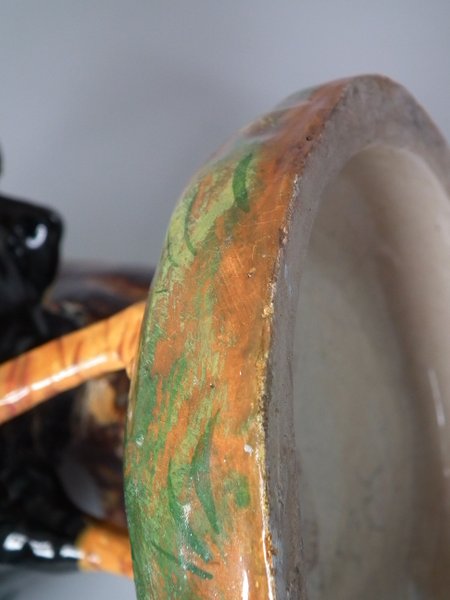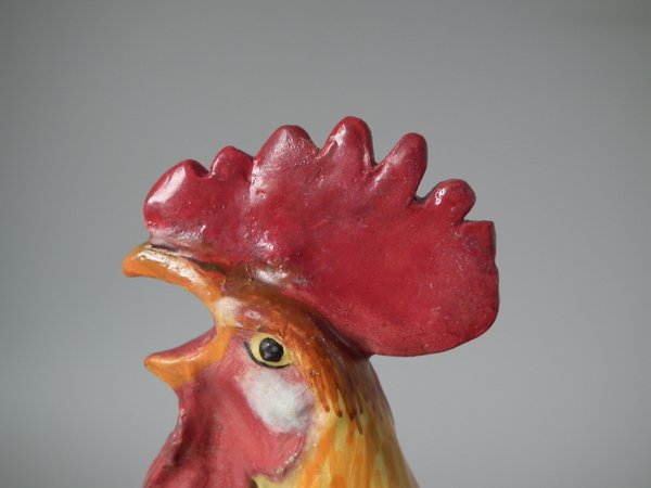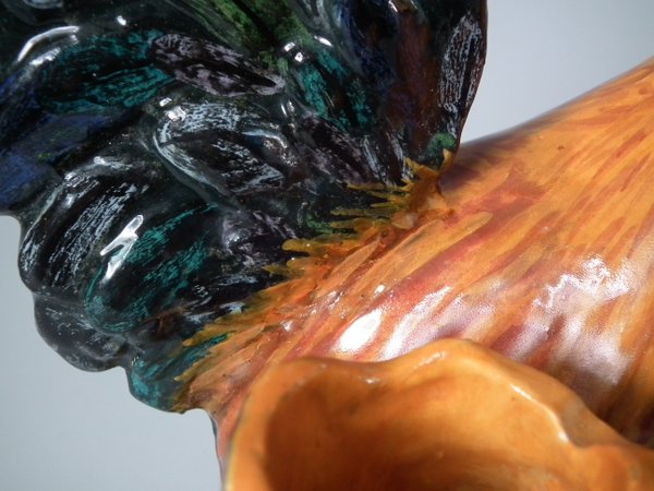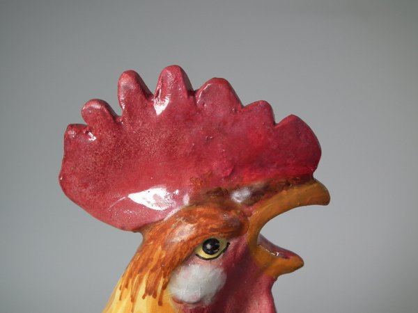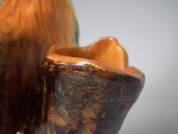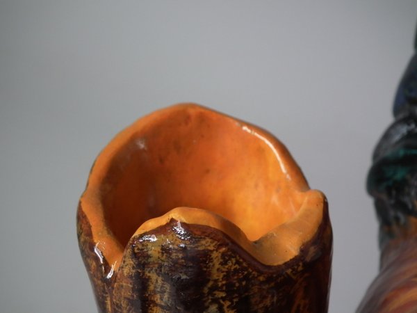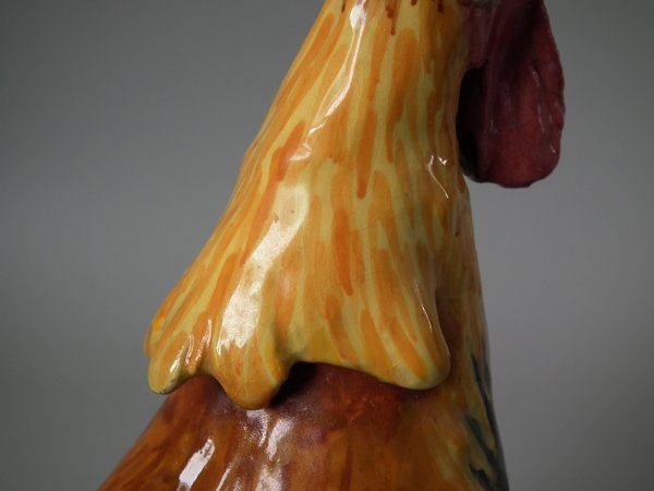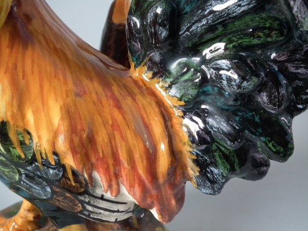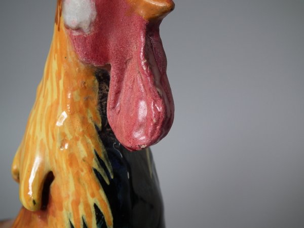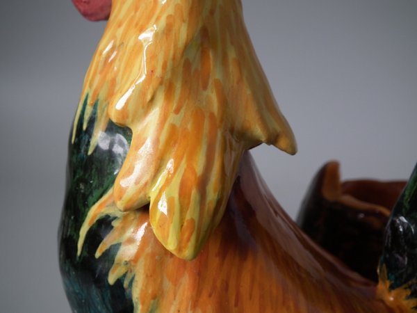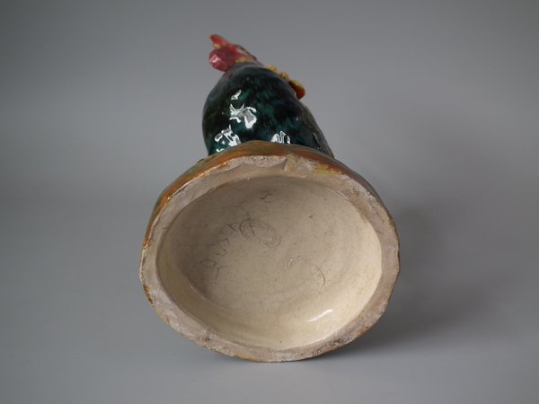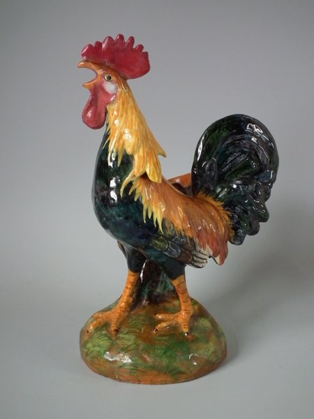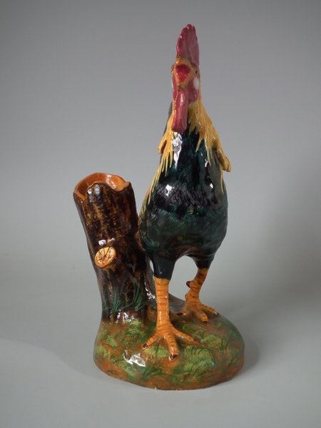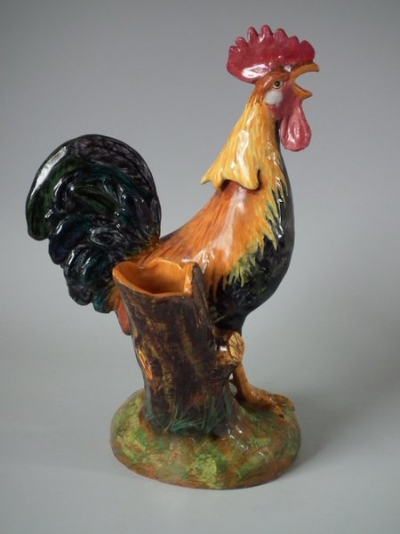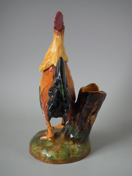 Victorian, circa 1890. 11.4ins high, 7.5ins wide, 5.9ins depth. Jerome Massier Majolica spill vase which features a cockerel/rooster stood