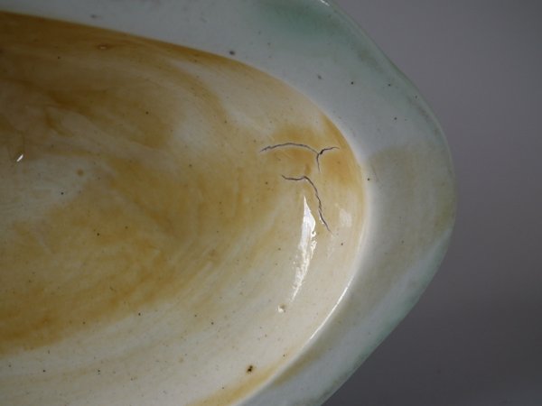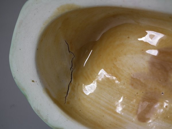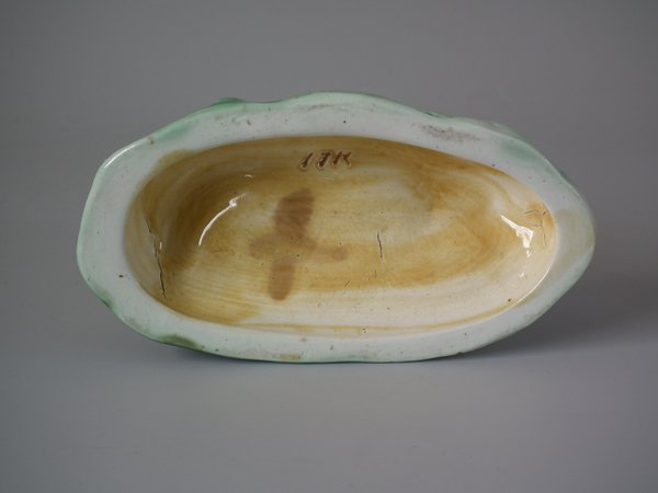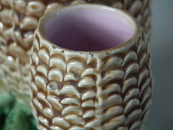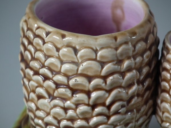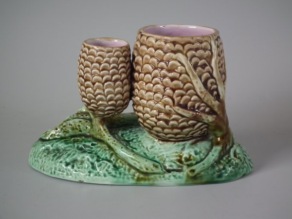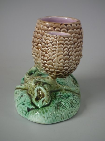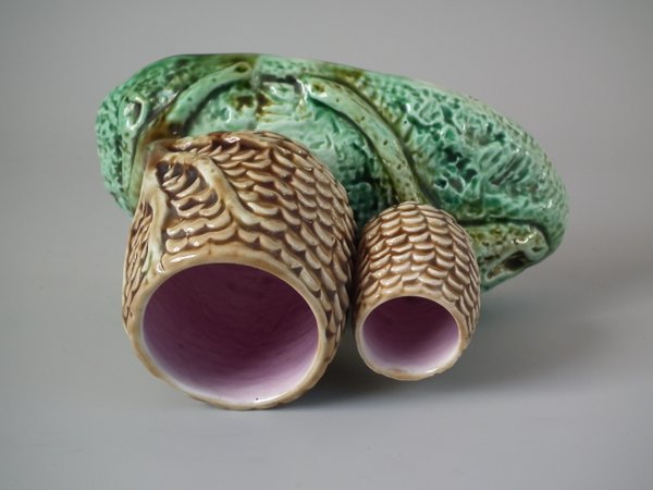 Victorian, circa 1880. 4.1ins high, 6.5ins wide, 3.5ins depth. Majolica posy holder which features pine cones and foliage.