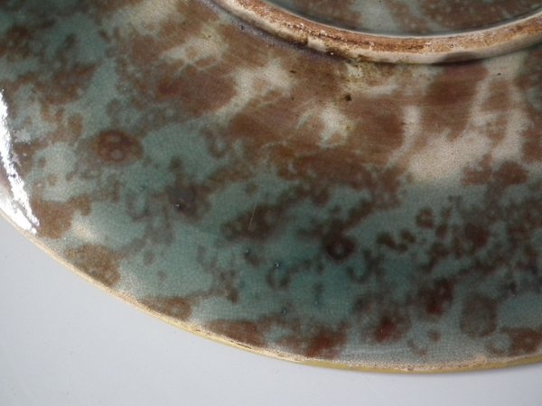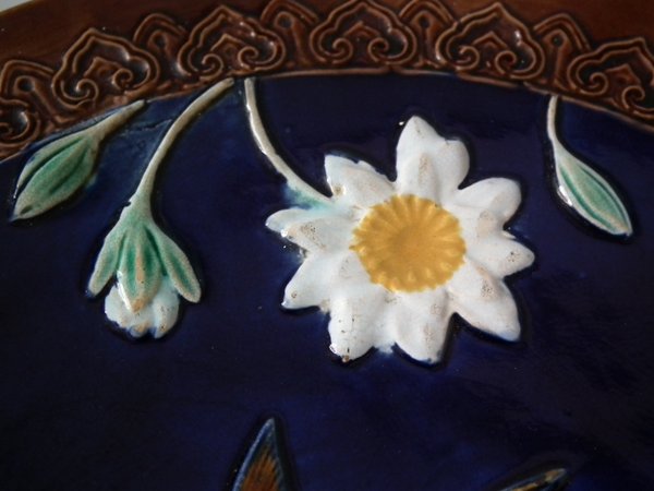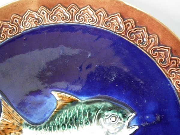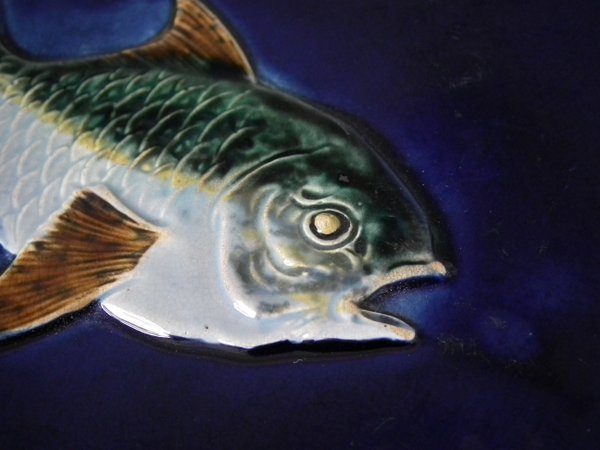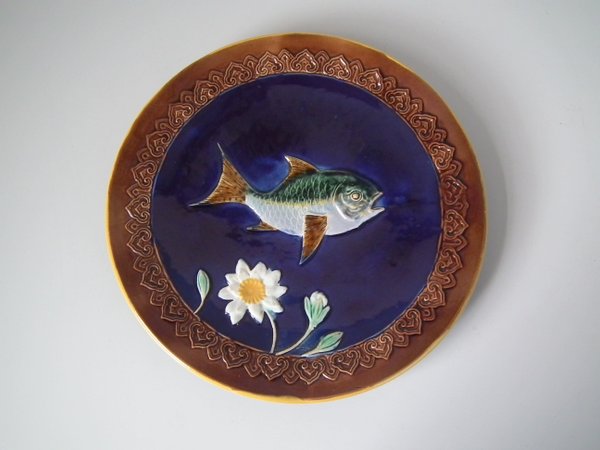 Victorian, circa 1870. 8.7ins high, 8.7ins wide, 1ins depth. Holdcroft Majolica plate which features a fish and pond lily.