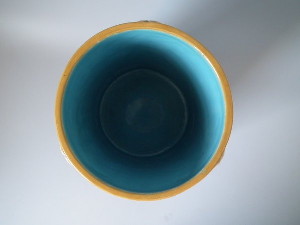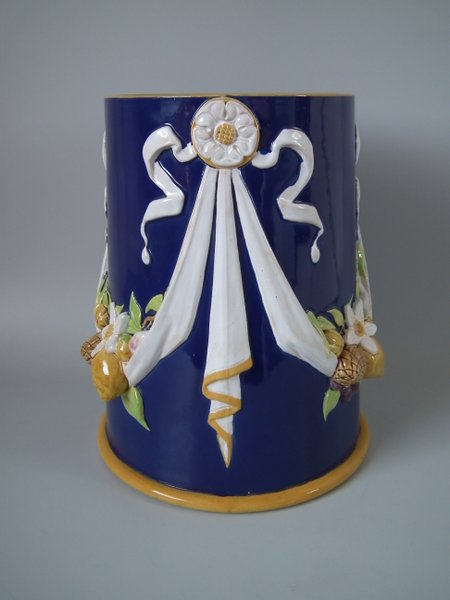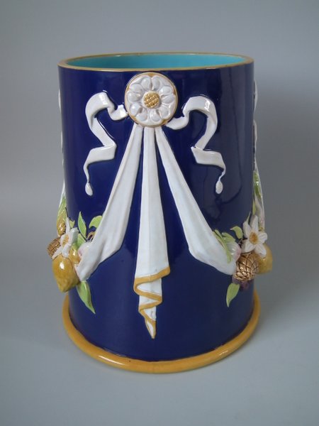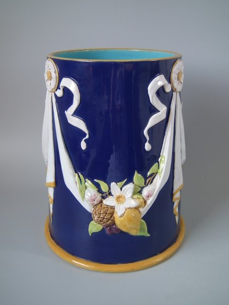Victorian, circa 1867. 11.2ins high, 9.3ins wide, 9.3ins depth. Minton Majolica vase which features festoons of drapery, holding flowers, fruit (lemon, apple) and pine cones.