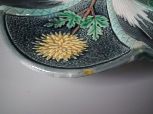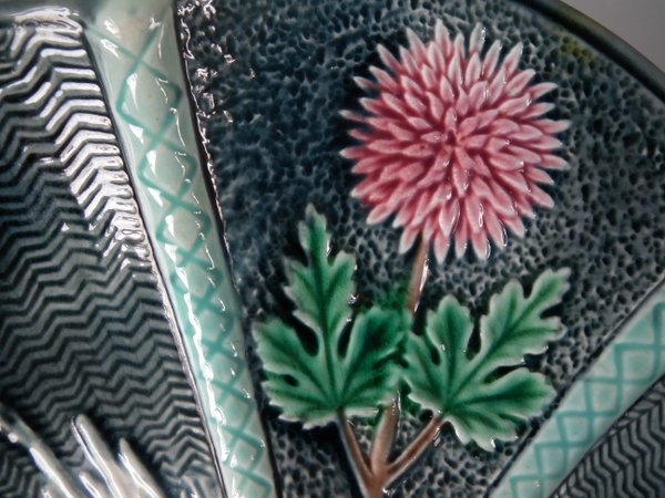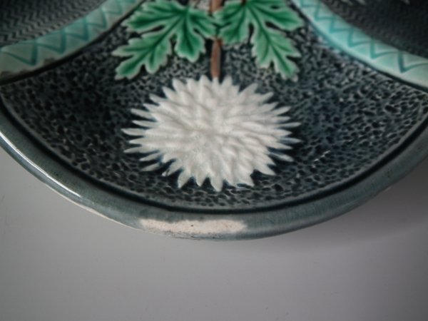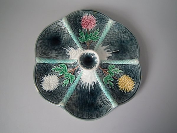 Wedgwood Majolica oyster plate which features chrysanthemum sprays.