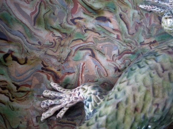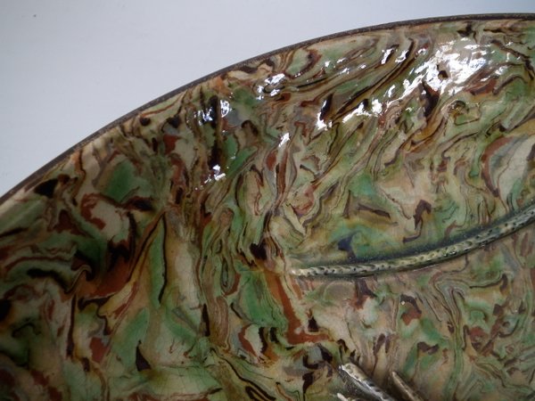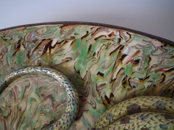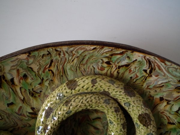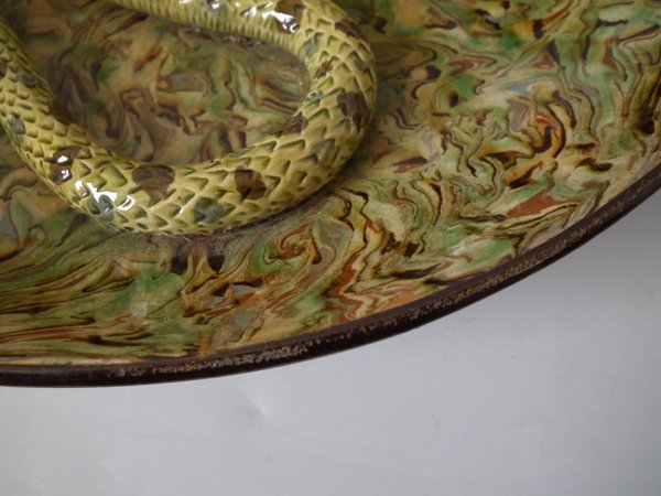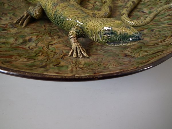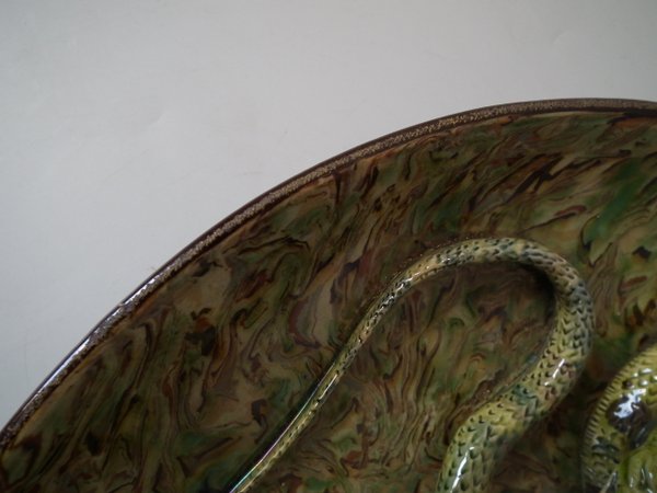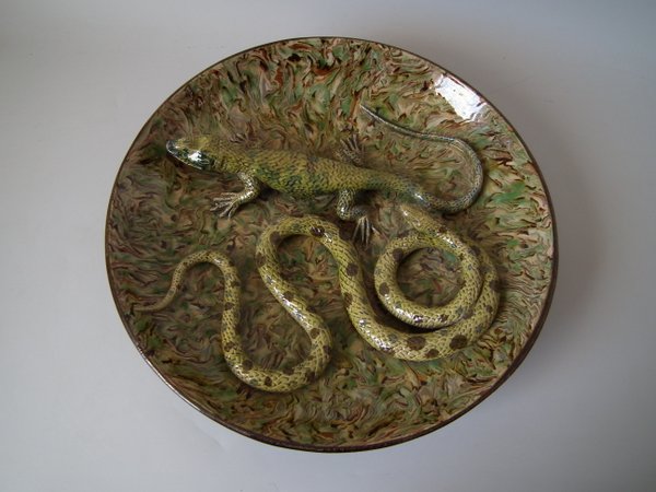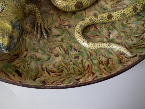 Circa 1900. 13.9ins high, 13.9ins wide, 2.8ins depth. APT Ware French Palissy Majolica wall charger which features a lizard and snake.