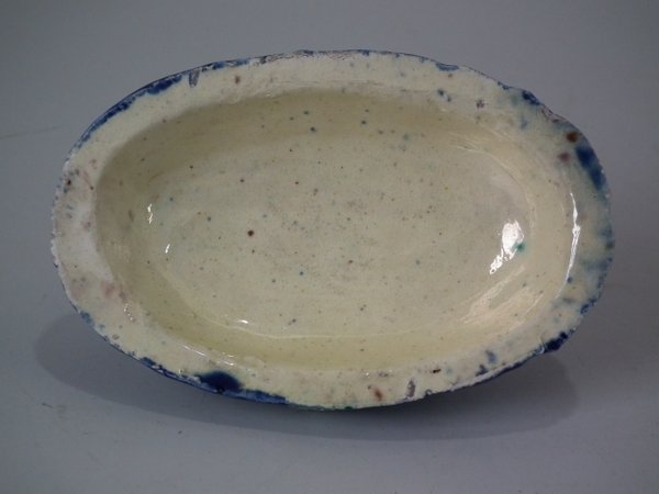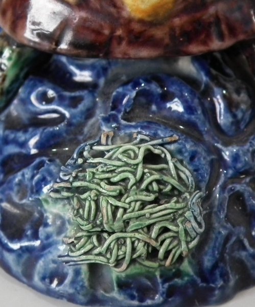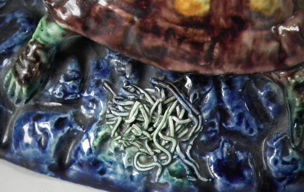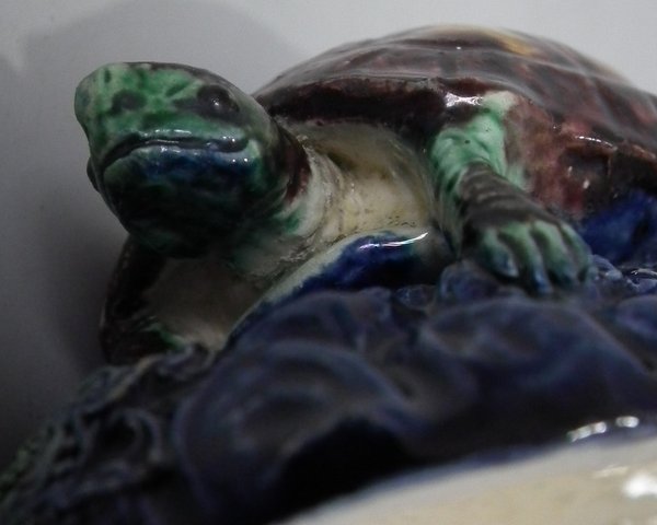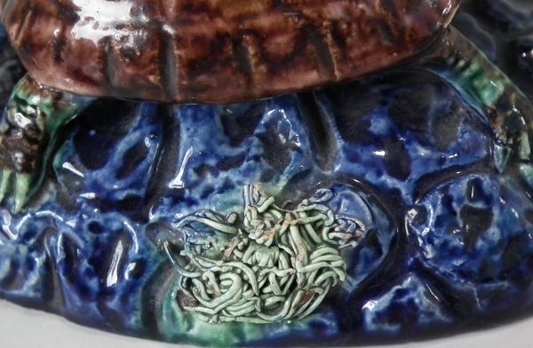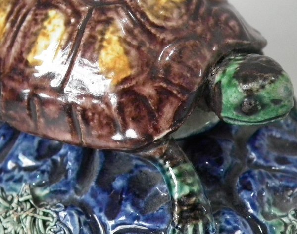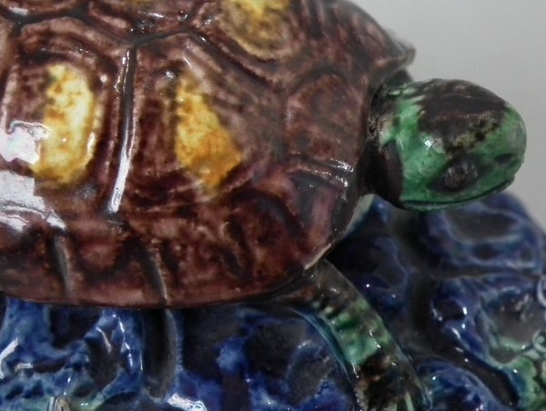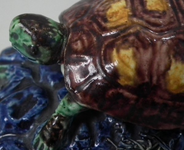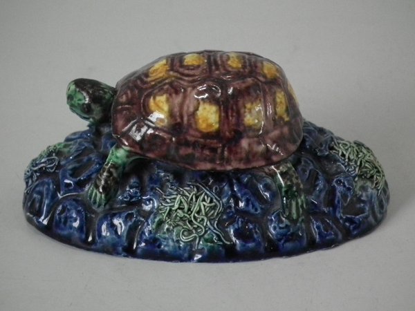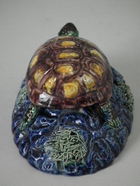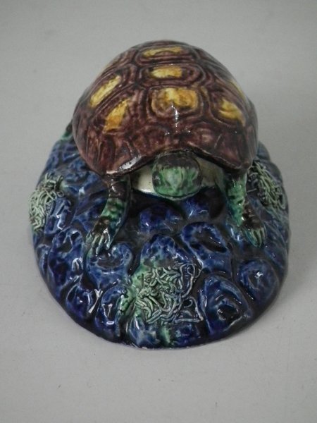 Victorian, circa 1890. 1.8ins high, 3.7ins wide, 2.4ins depth. Majolica figural which features a tortoise resting on a rock. Colouration: brown, cobalt blue, ochre, are predominant.