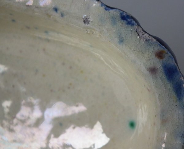 Some small flakes to shredded clay and one to edge of tortoise shell.