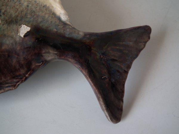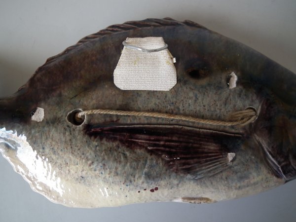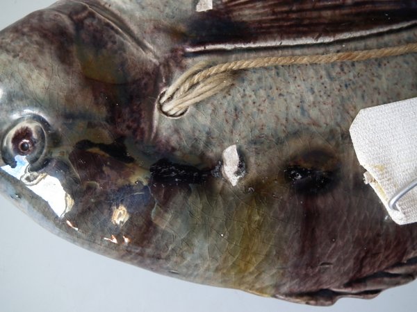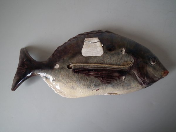 Victorian, circa 1890. 4.6ins high, 10.4ins wide, 1.8ins depth. Palissy Majolica wall plaque which features a fish.
