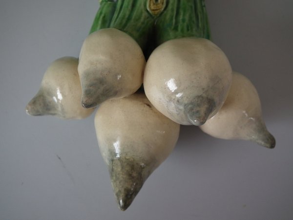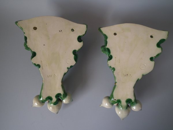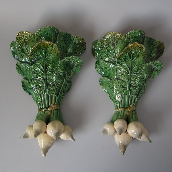 Early 20thC, circa 1920. Tallest is 11ins high, 7.5ins wide, 3.9ins depth. Pair of Bordalo Pinheiro Portuguese Palissy Majolica wall pockets which feature a bunch of turnips.
