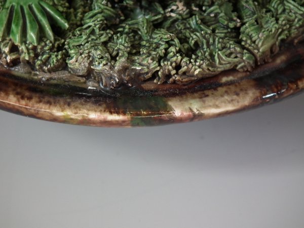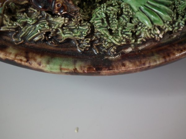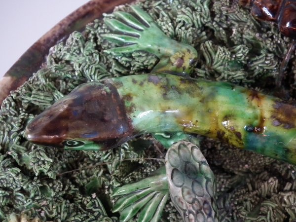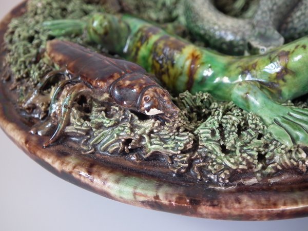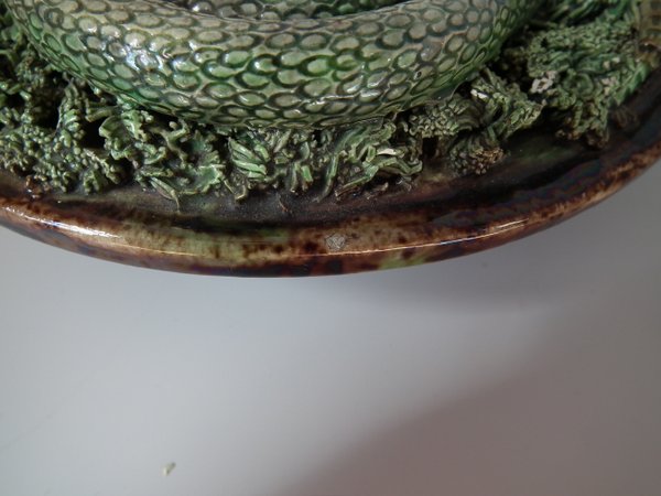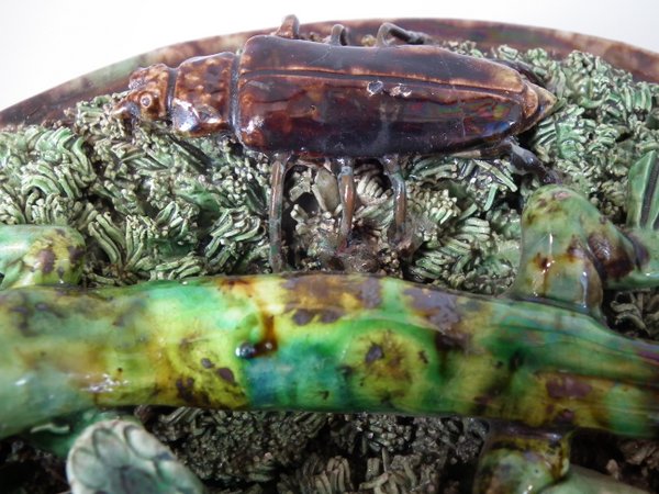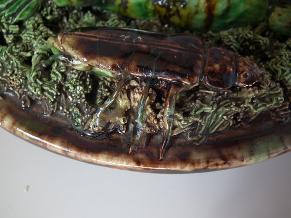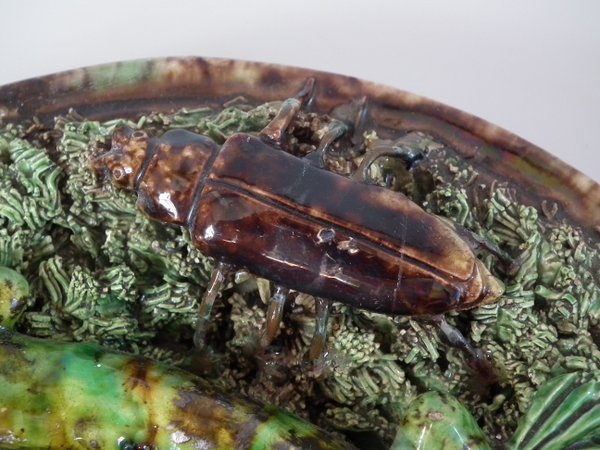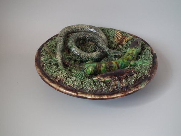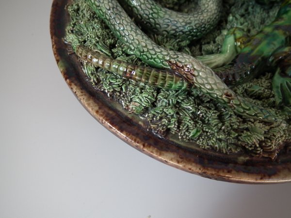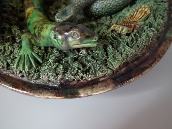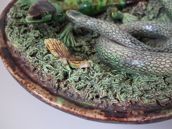 Circa 1890. 7.1ins high, 7.1ins wide, 2.4ins depth. Mafra Portuguese Palissy Majolica wall plate which features a lizard, snake, a beetle and a moth. Colouration: green, brown, ochre, are predominant.