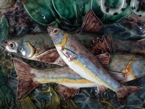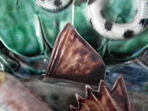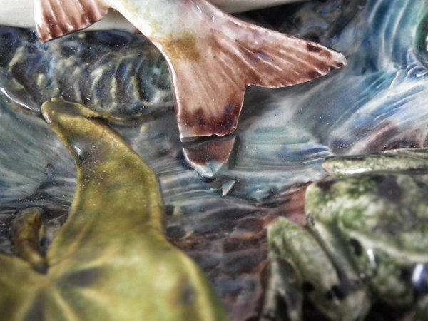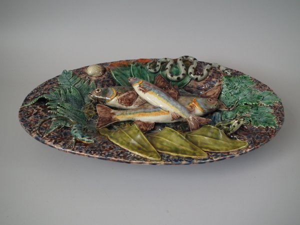 Victorian, circa 1875. 9.4ins high, 13.8ins wide, 2.2ins depth. Thomas Sergent French Palissy Majolica wall platter which features three fish, a lizard, a snake and a frog.