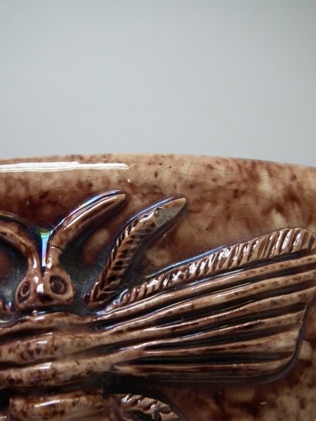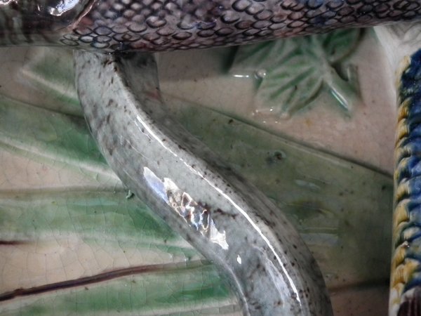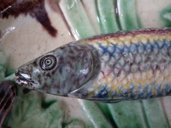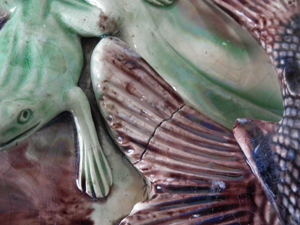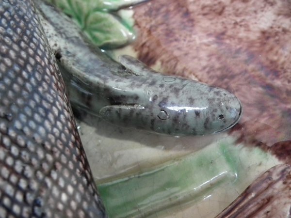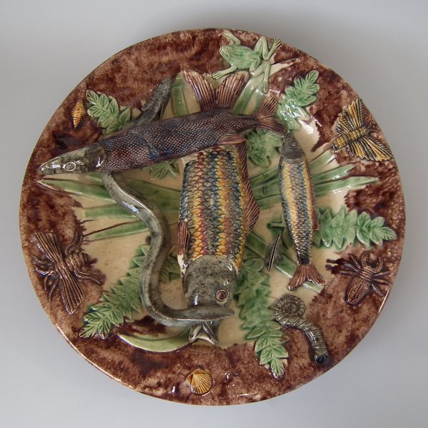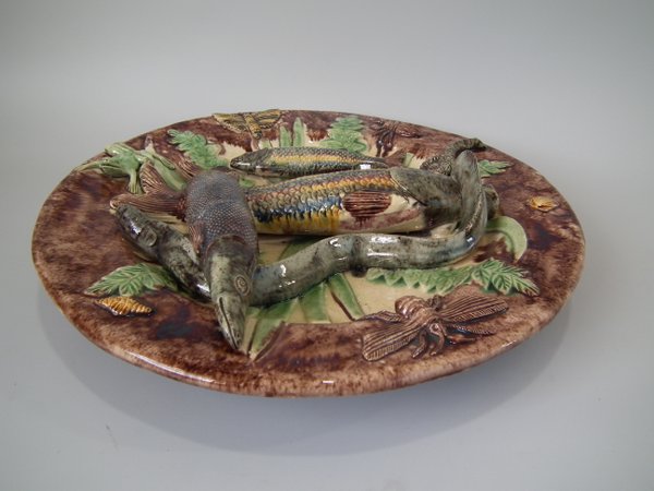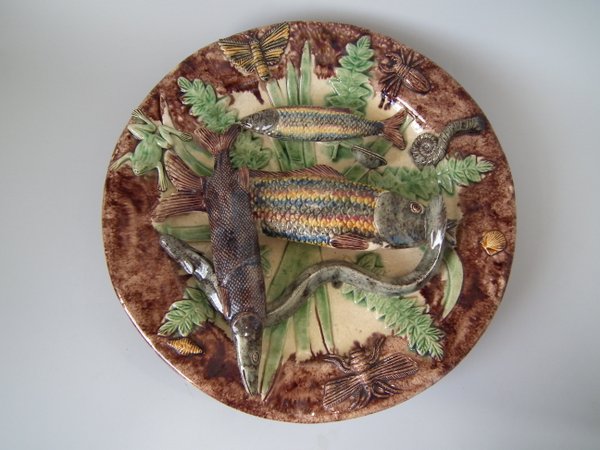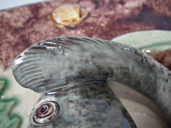 Circa 1890. 15.6ins high, 15.6ins wide, 3.5ins depth. Mafra Majolica wall plate which features an eel and three fish.