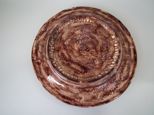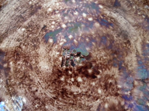 KILN EFFECTS: kiln detritus caught in the glaze to the ground.