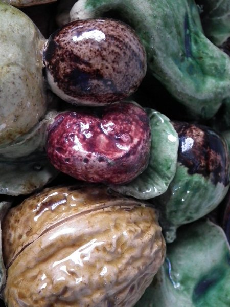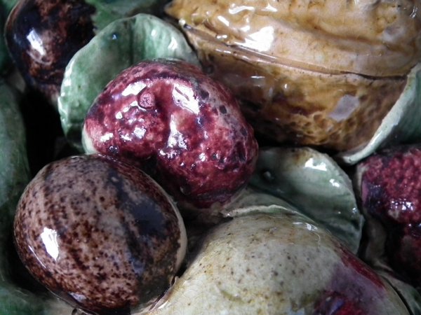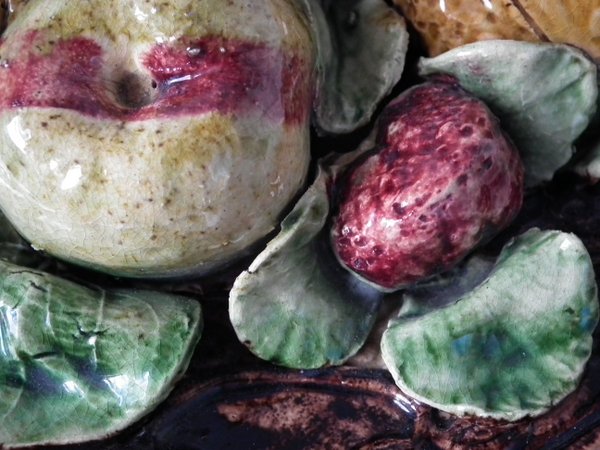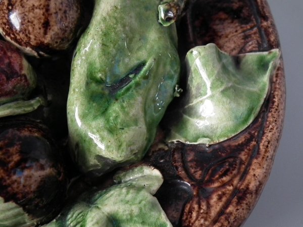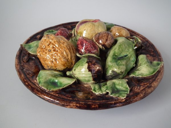 Circa 1890. 7.1ins high, 7.1ins wide, 2.4ins depth. Jose Francisco de Sousa Portuguese Palissy Majolica wall plate which features fruit, nuts and leaves to the front.