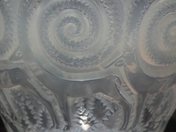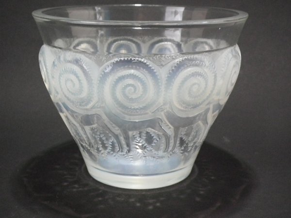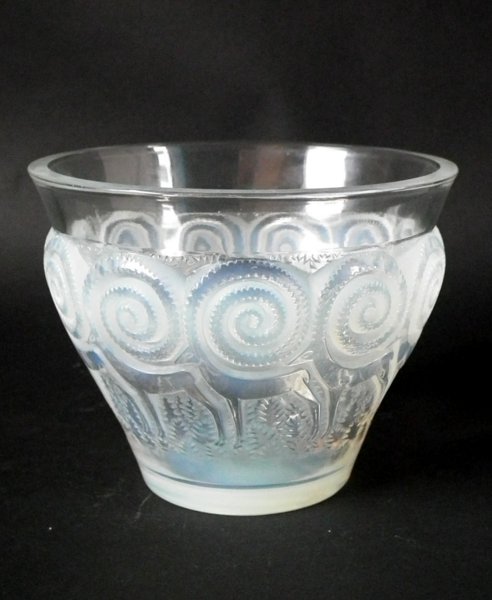 Introduced in 1933. Height: 12.2cm (4.8ins). Width: 15.5cm (6.1ins). Depth: 15.5cm (6.1ins).. Rene Lalique Opalescent Glass 'Rennes' Vase. This pattern depicts reindeer amongst foliage. The antlers extend into swirls.