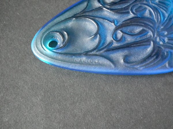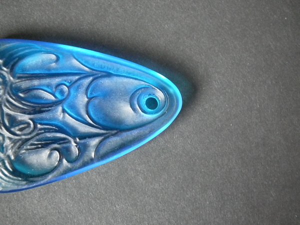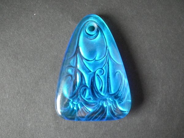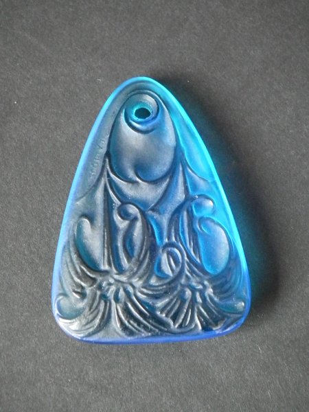 Introduced in 1920. Height: 6cm (2.36ins). Width: 3.5cm (1.38ins). Depth: 0.5cm (0.2ins).. Rene Lalique electric blue colour glass, 'Lys' pendant.