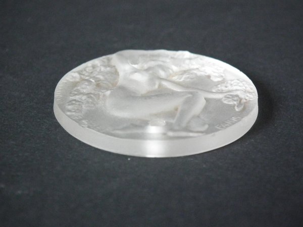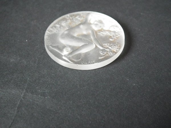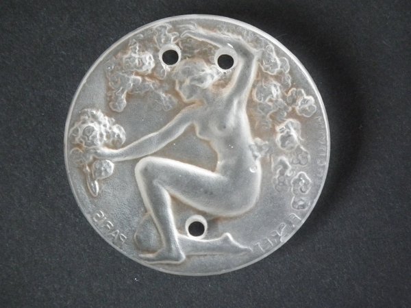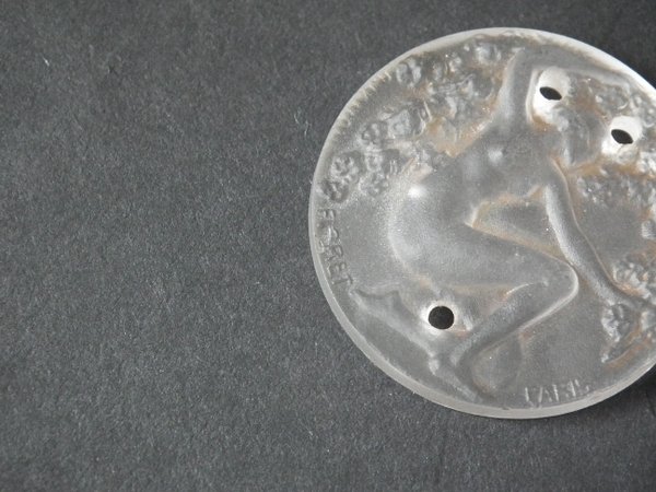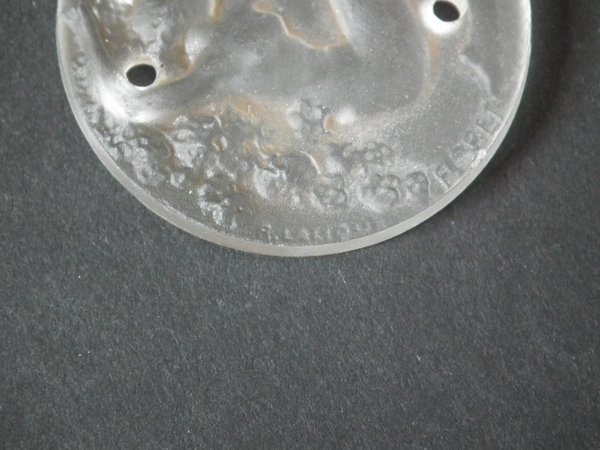 Moulded/intaglio makers mark, 'Fioret Paris R Lalique'. Marcilhac Fioret 4. Fioret was a Parisian perfume house active from 1914. These pendants/medallions came with the perfume.