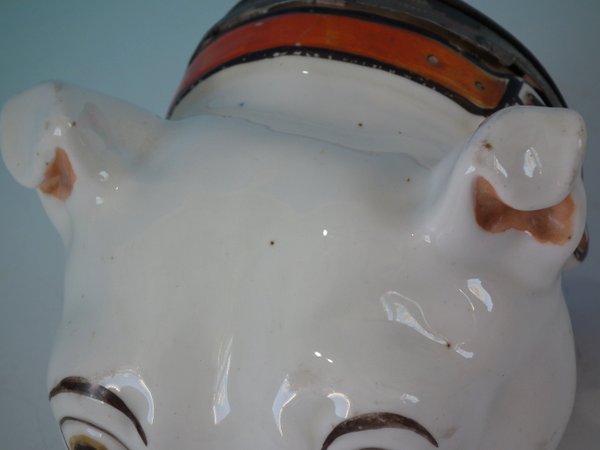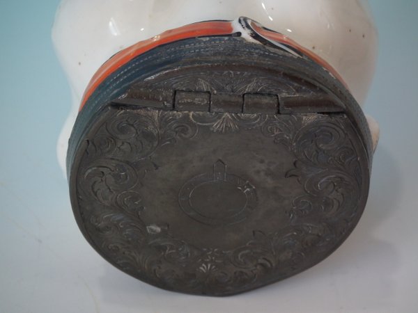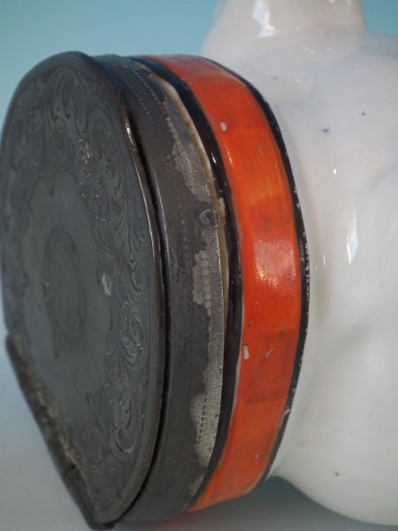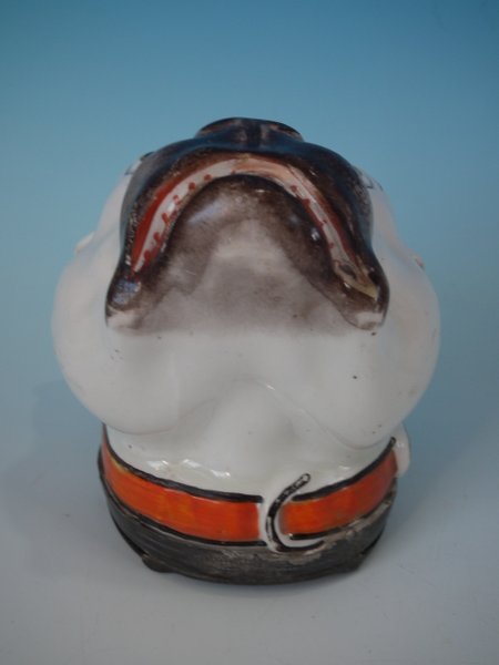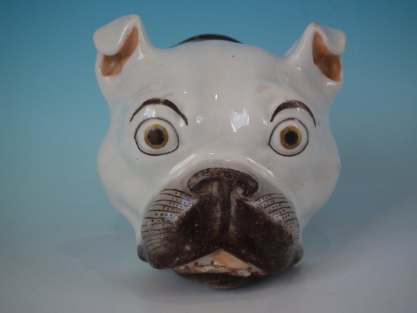 Staffordshire Pottery tobacco jar and cover which features a bulldog head, stood directly on the ground, no base.