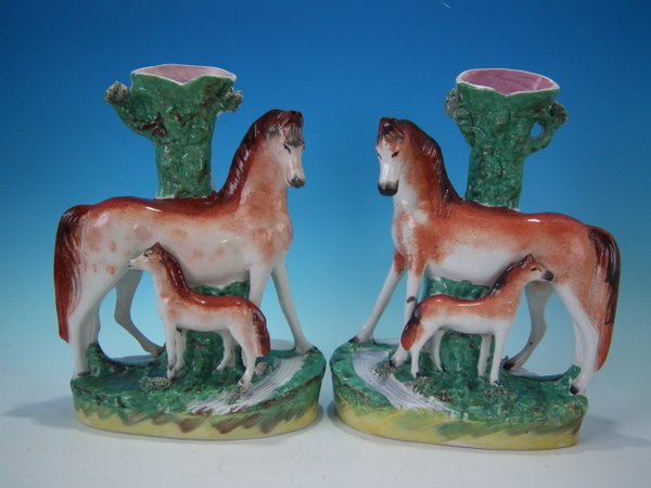 Pair of Staffordshire Pottery spill vases which feature a horse and foal, stood on an oval base.