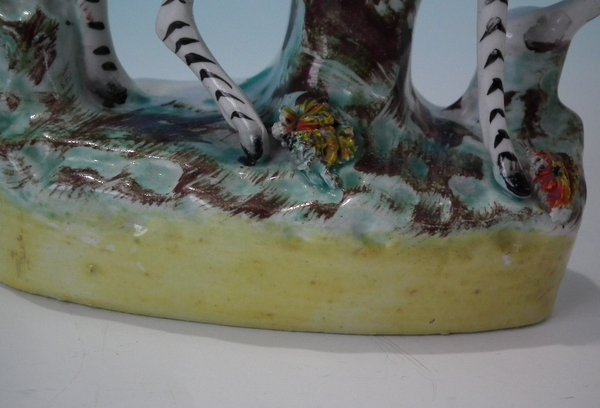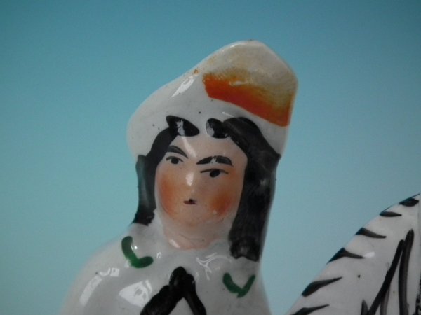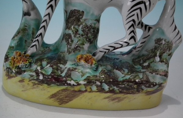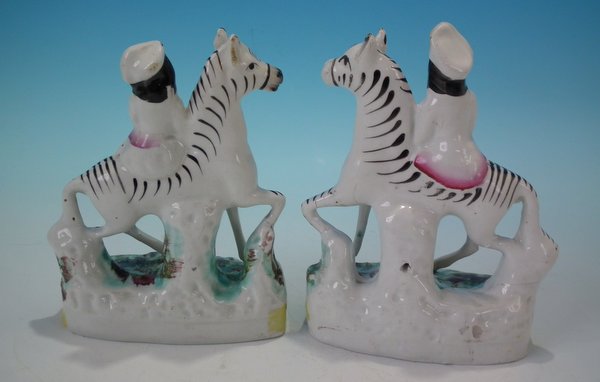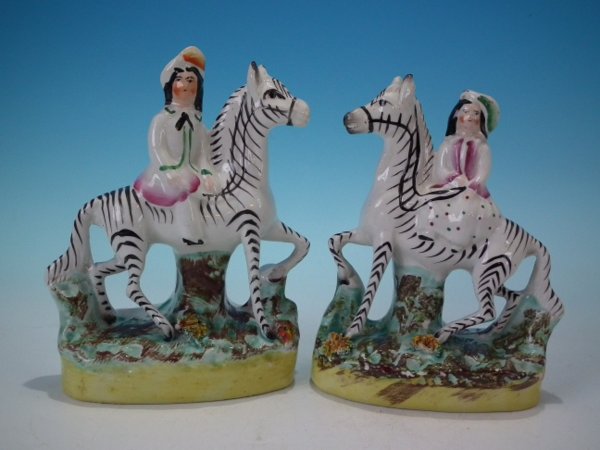 Pair of Staffordshire Pottery figures with a childhood theme which feature a boy and a girl on zebras, stood on an oval base.