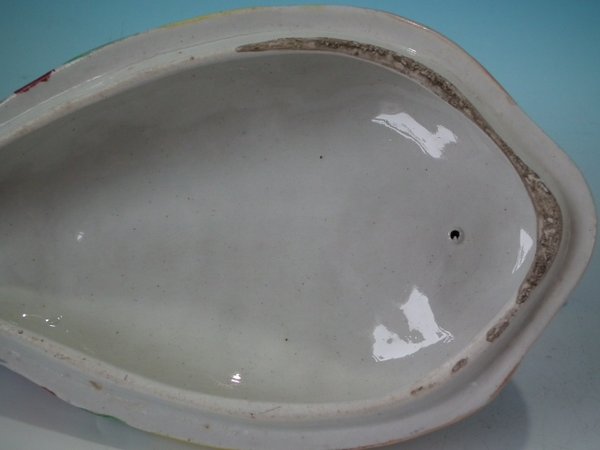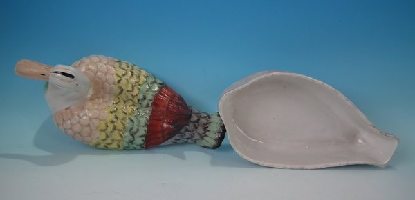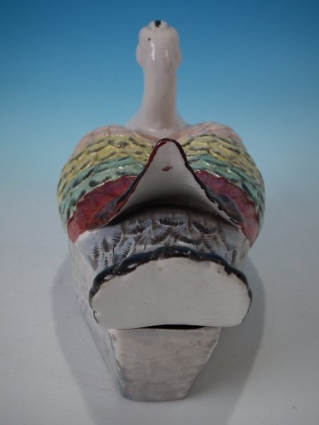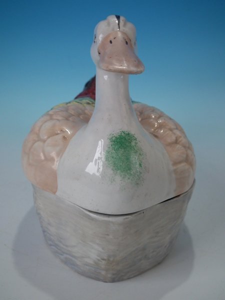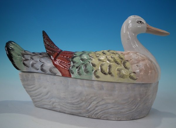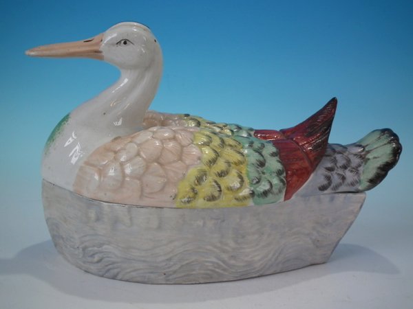Staffordshire Pottery tureen with cover which features a duck on water, seated on a separate base.