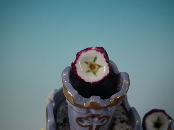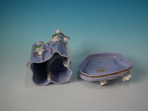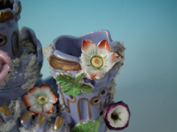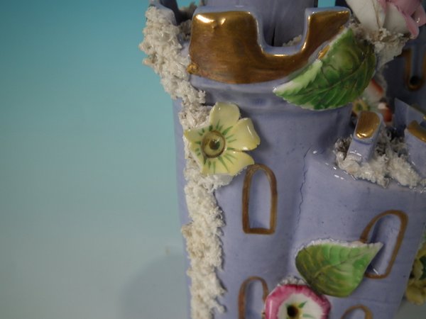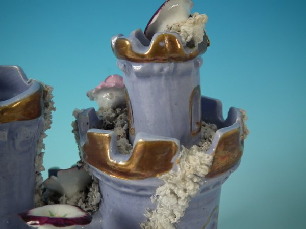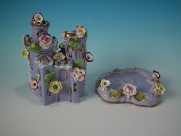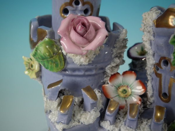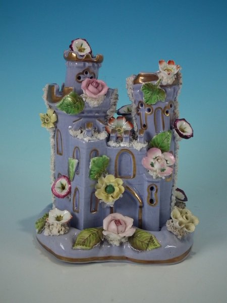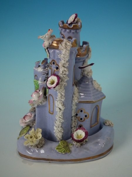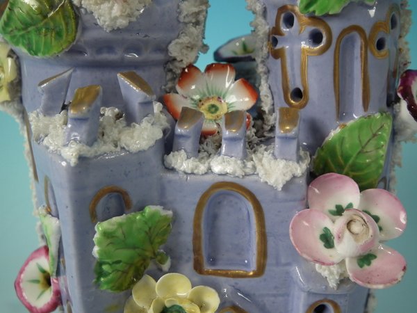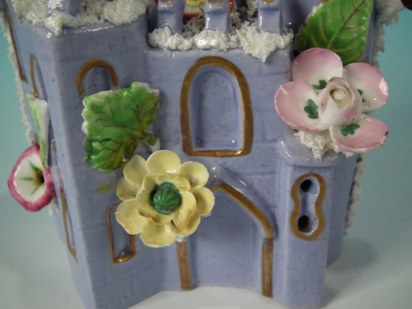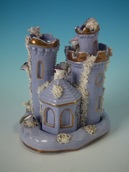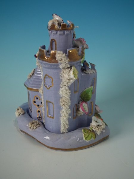 Victorian, circa 1860. 6.9ins high, 5.9ins wide, 5.9ins depth. Staffordshire Pottery pastille burner which features a castle decorated with applied flowers, stood on a separate base. Lilac version.