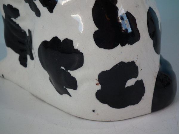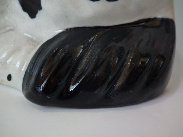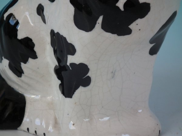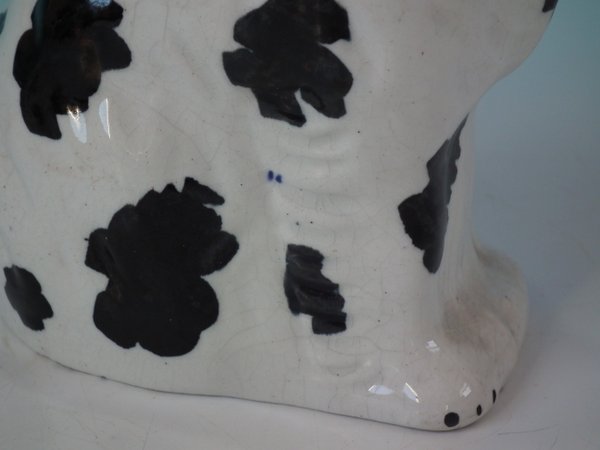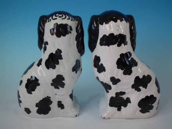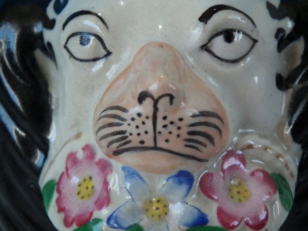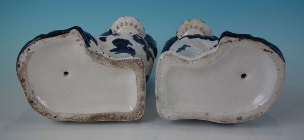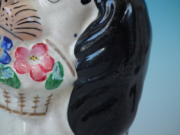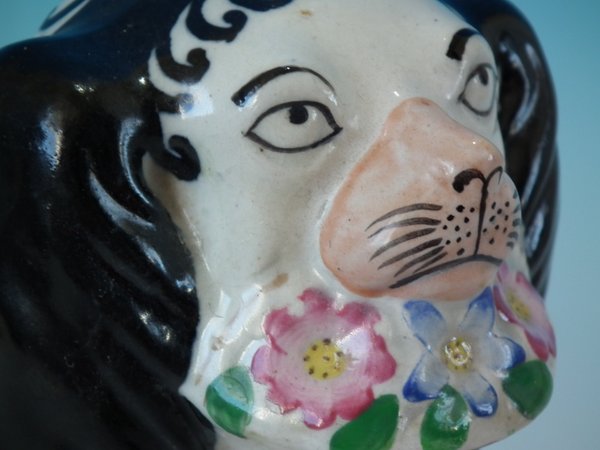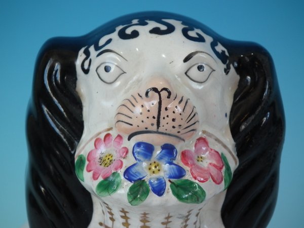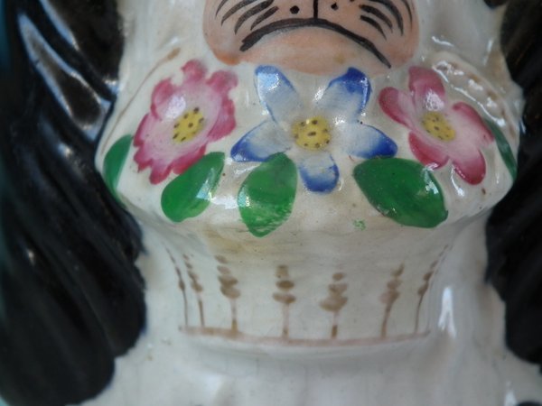 Pair of Staffordshire Pottery figures which feature a spaniel with Disraeli curls on it's head and a flower basket in it's mouth (The curls represent Disraeli's, elected Prime Minister 1868 and Queen Victoria’s favourite), seated directly on the ground, no base.