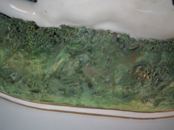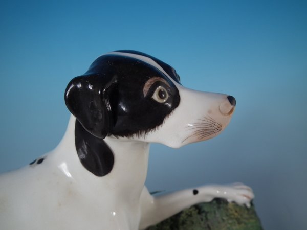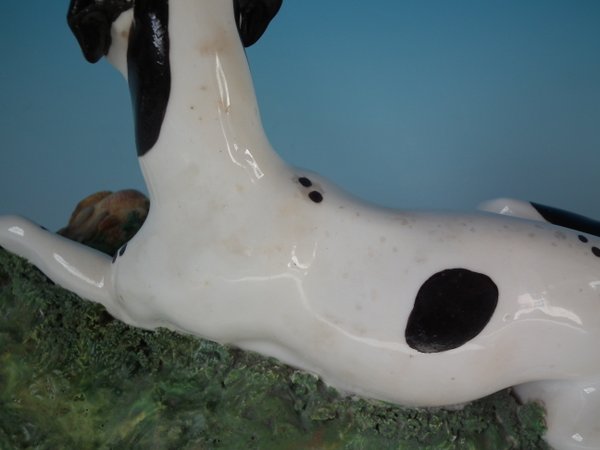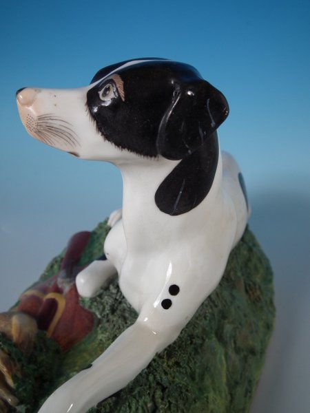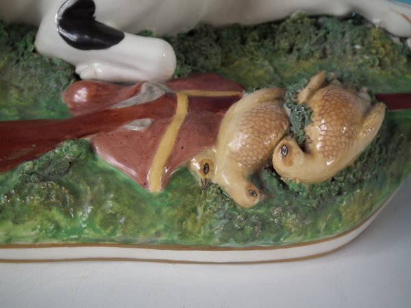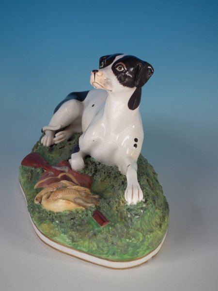 with a gun and game birds, recumbent on a shaped base.