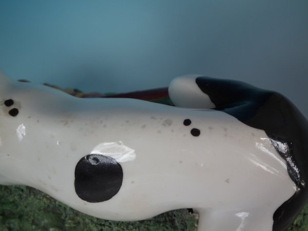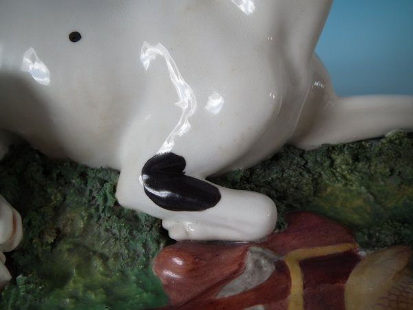 Retouched paint losses to black spots on the dog.