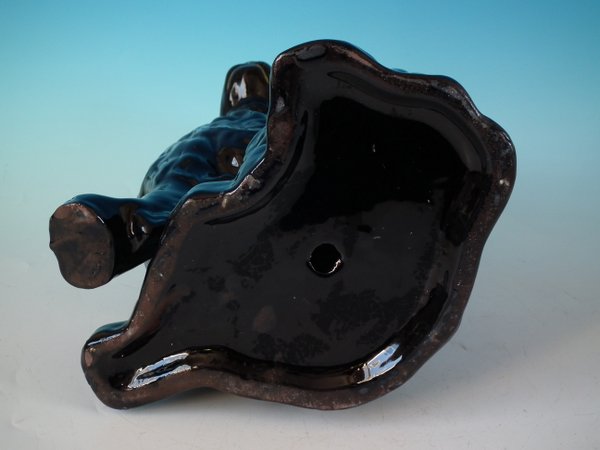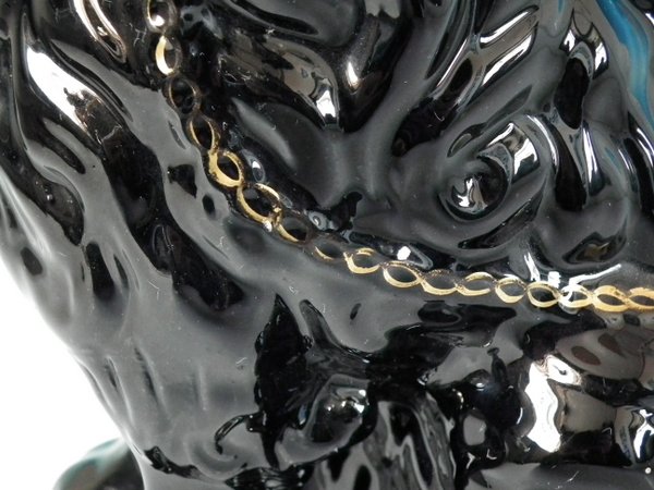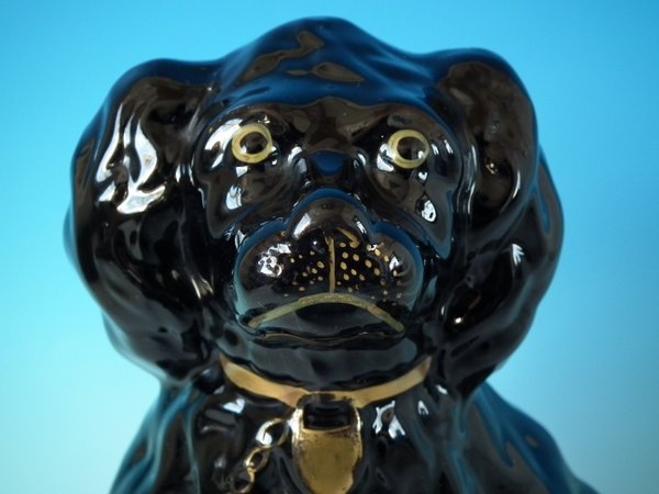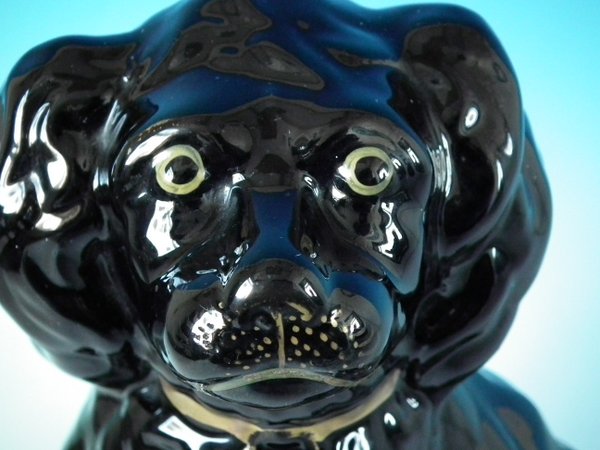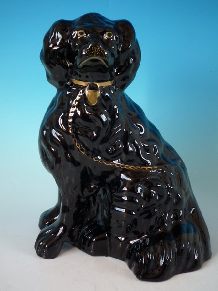 Victorian, circa 1860. 11.8ins high, 9.4ins wide, 7.5ins depth. Staffordshire Pottery figure which features a 'chunky' spaniel with front leg molded free, seated directly on the ground, no base. Jackfield black version. Dull gilt embellishment.