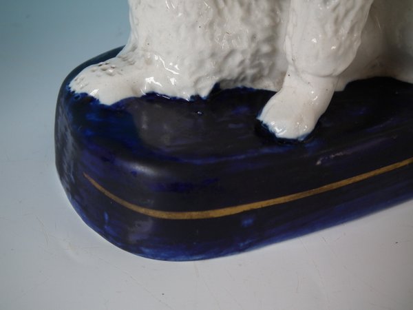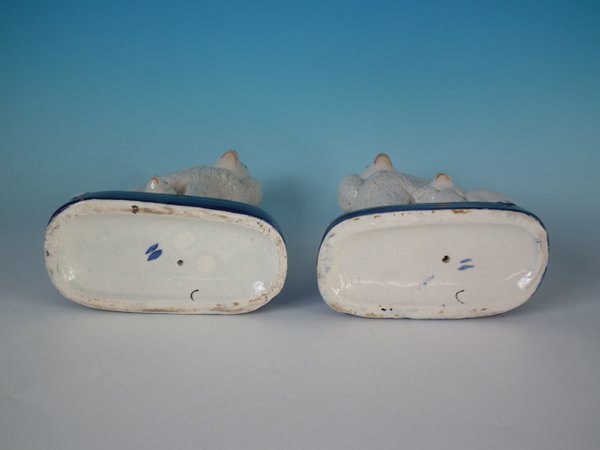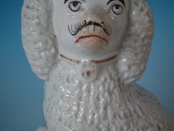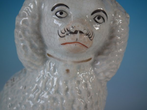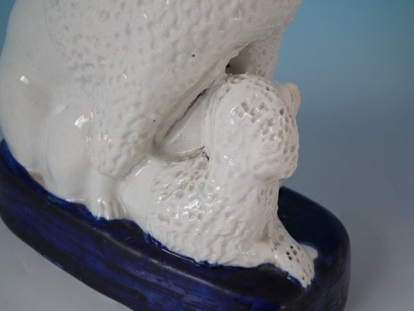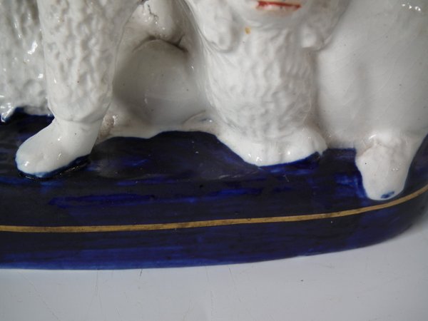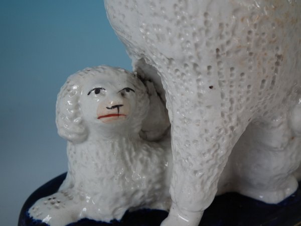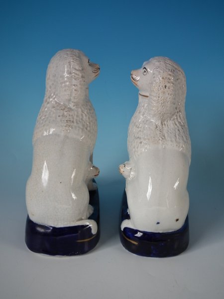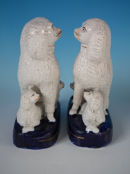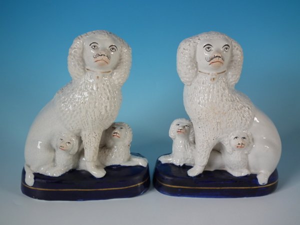 Victorian, circa 1860. Tallest is 7.1ins high, 5.9ins wide, 6.9ins depth. Pair of Staffordshire Pottery groups which feature a poodle and her two pups,