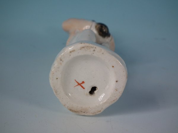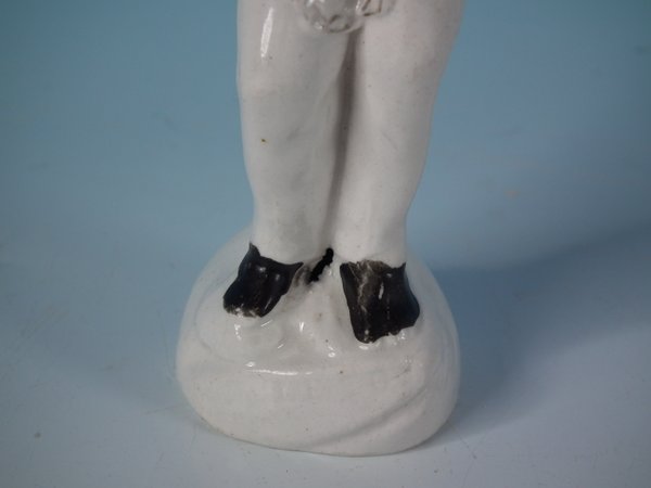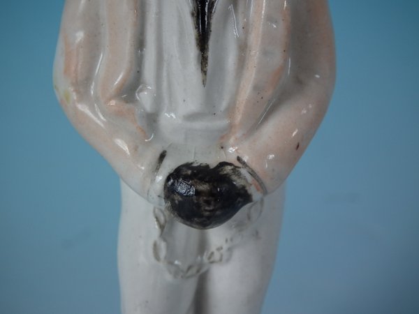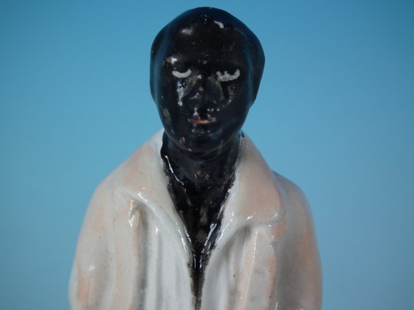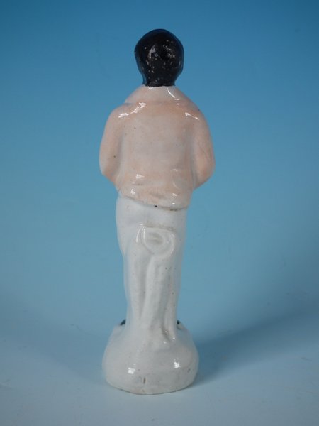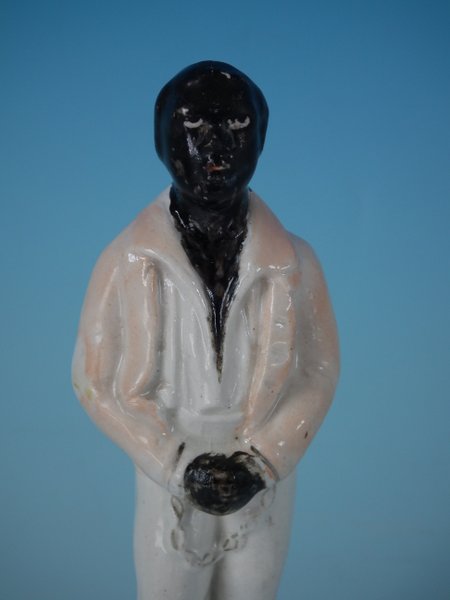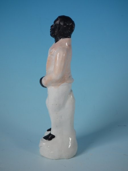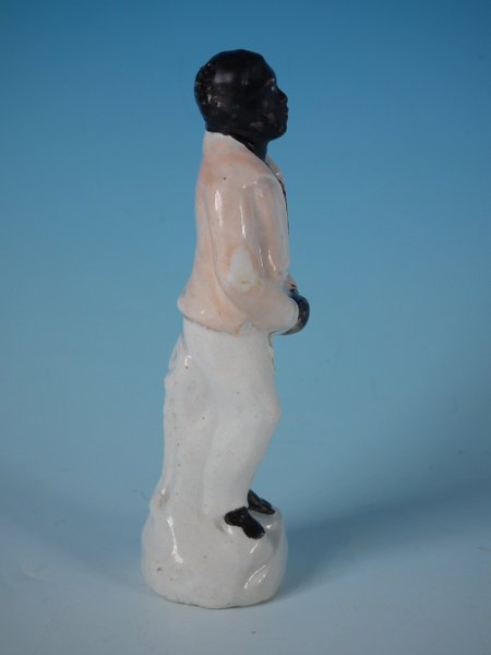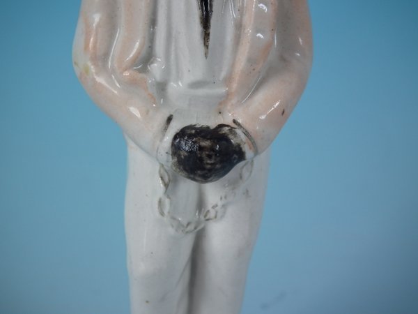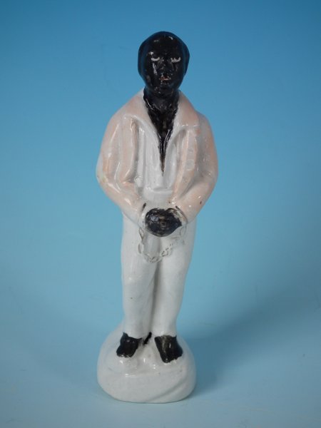 Victorian, circa 1860. 5.1ins high, 1.8ins wide, 1.6ins depth. Staffordshire Pottery figure which features a slave in chains, stood on a circular base.
