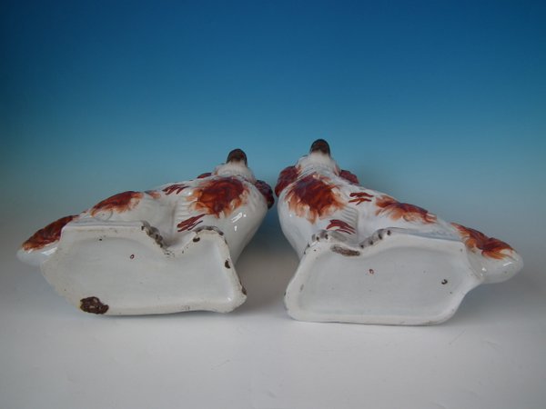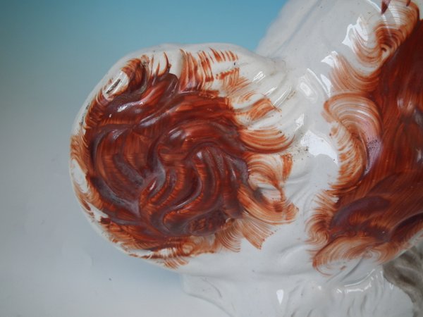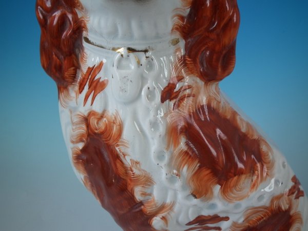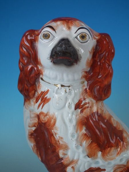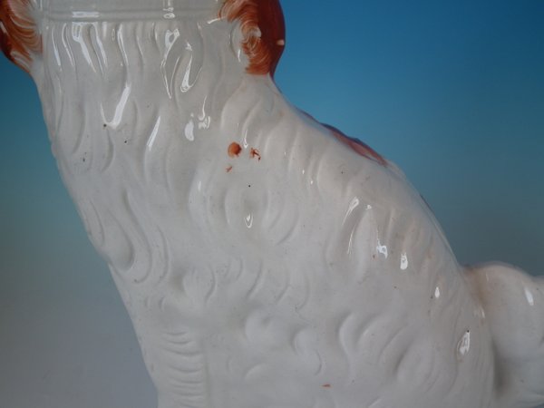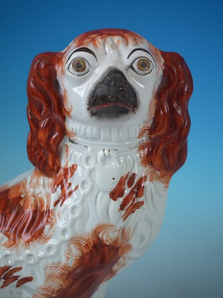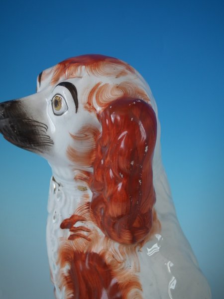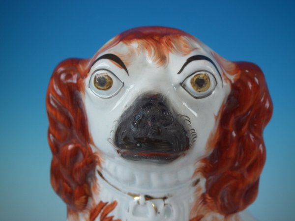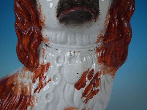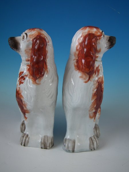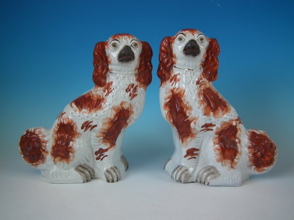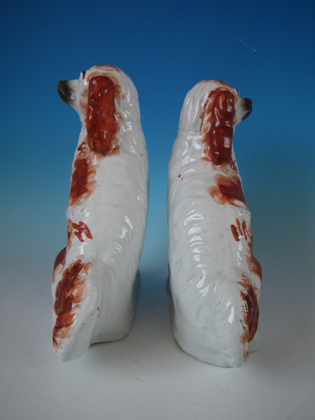 Pair of Staffordshire Pottery dogs which feature a spaniel with a curly tail, seated directly on the ground, no base.