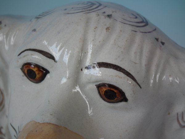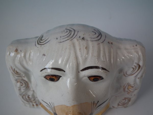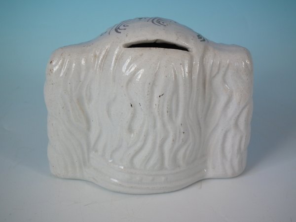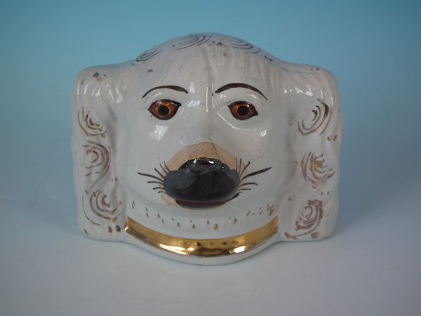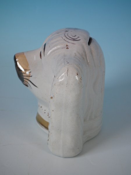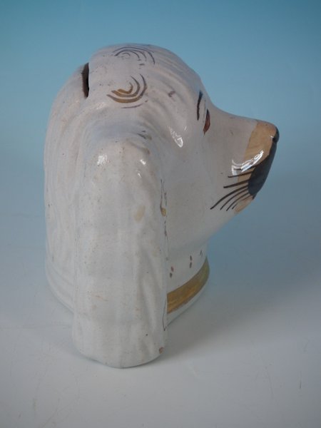 Victorian, circa 1890. 4.1ins high, 4.9ins wide, 3.7ins depth. Staffordshire Pottery money box which features a spaniel's head,