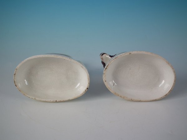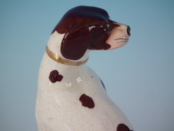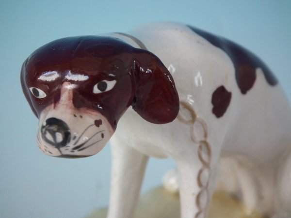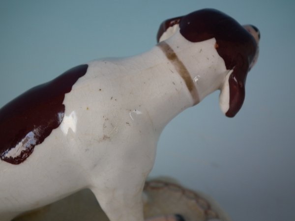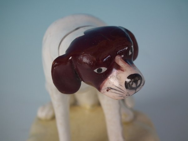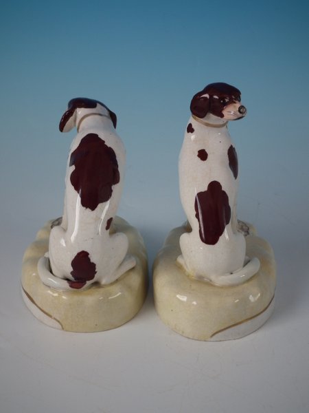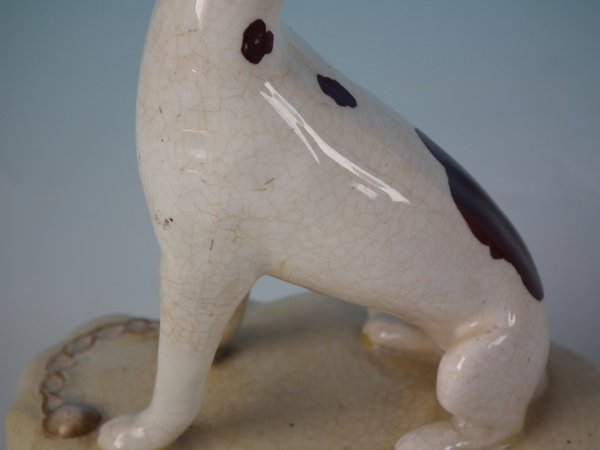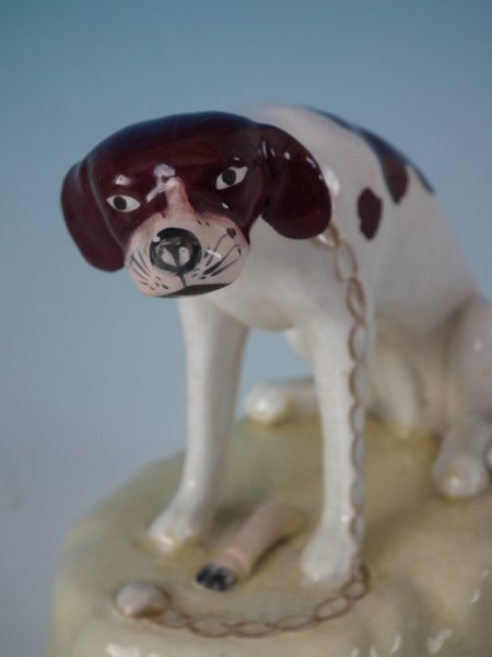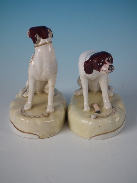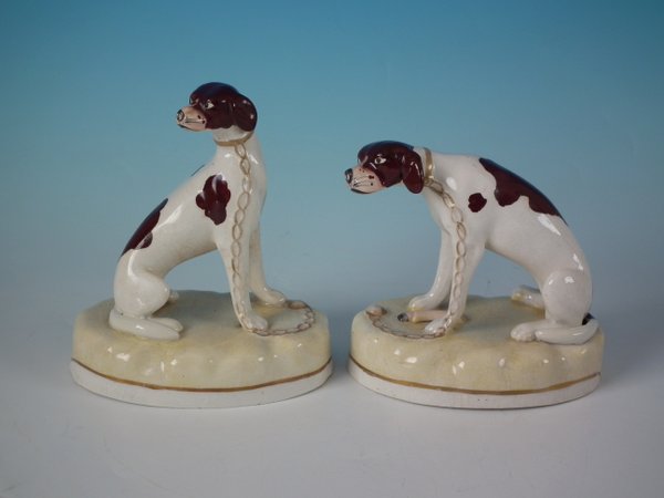 Pair of Alcock Staffordshire Pottery figures which feature a hound, chained up, seated on an oval base.
