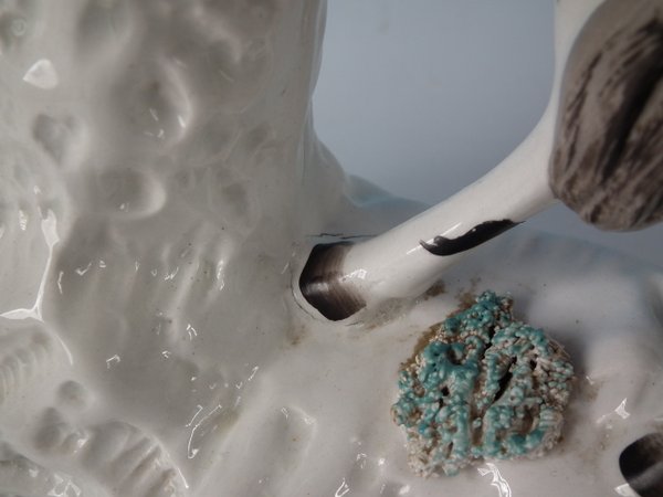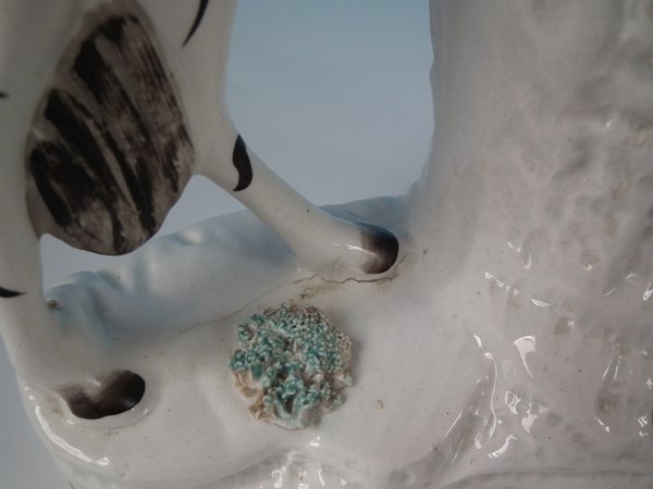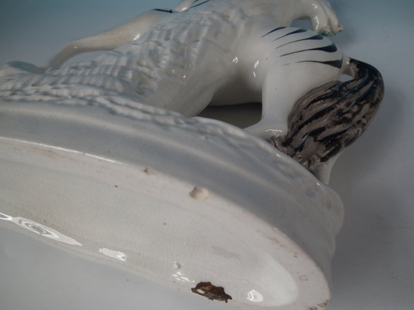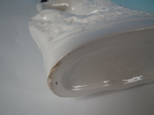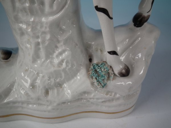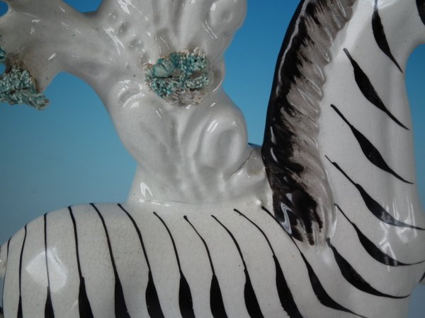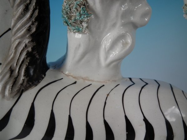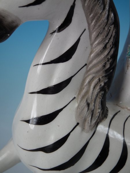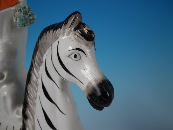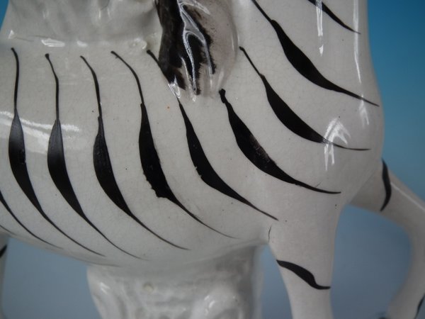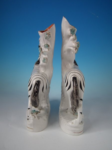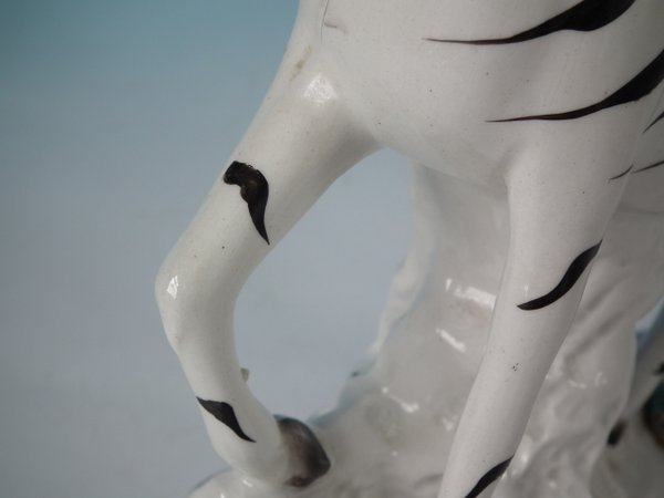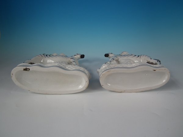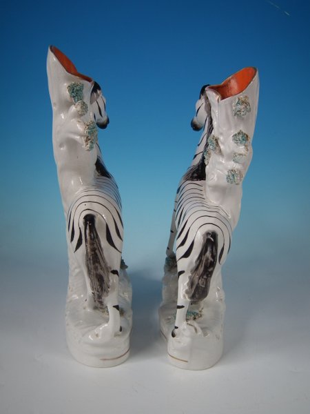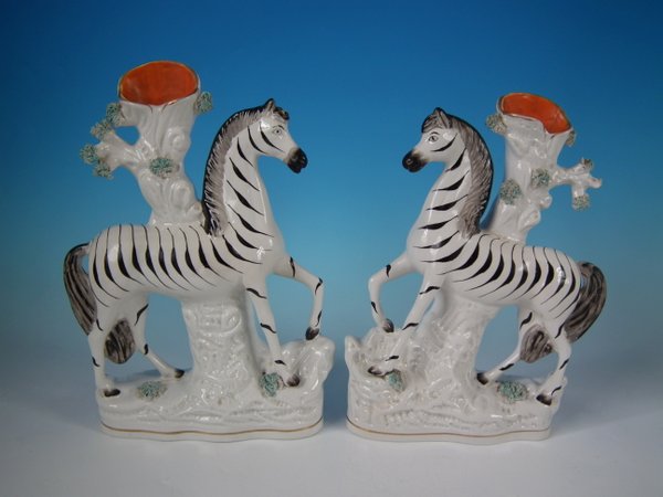 Victorian, circa 1860. Tallest is 11.4ins high, 8.3ins wide, 3ins depth. Pair of Staffordshire Pottery spill vases which feature a zebra,