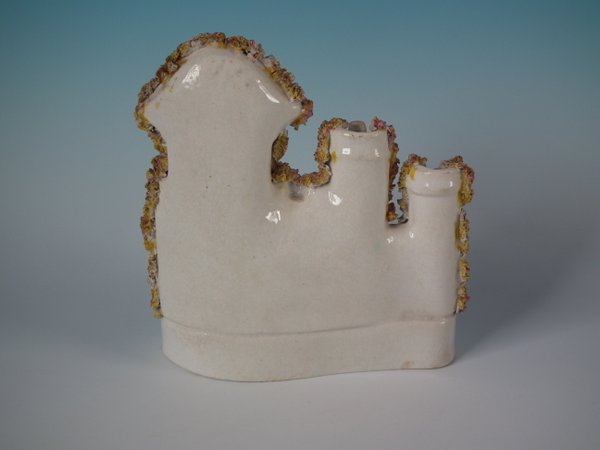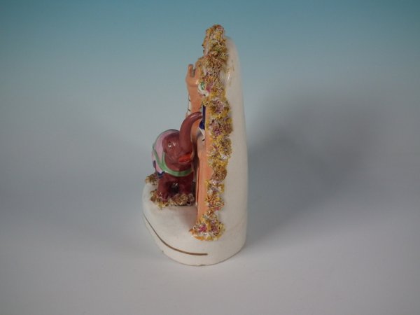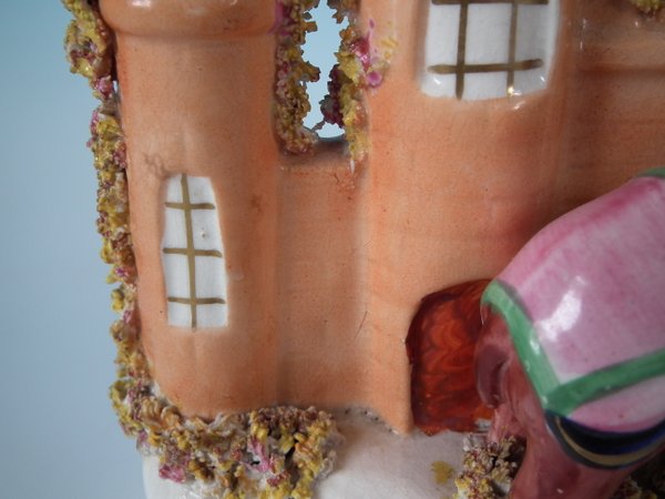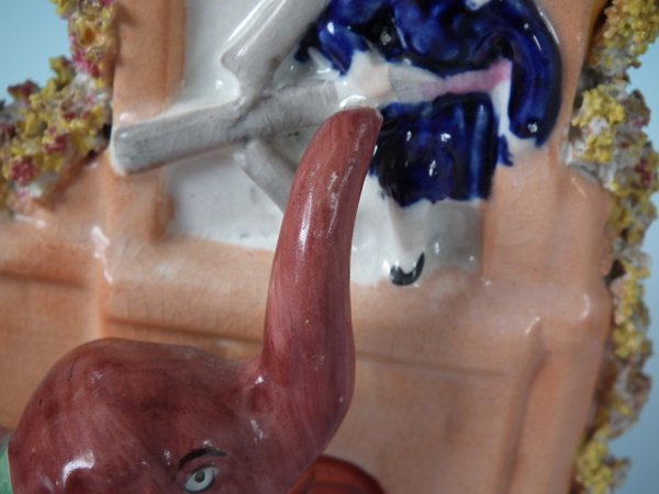 Victorian, circa 1860. 6.7ins high, 6.1ins wide, 3ins depth. Staffordshire Pottery castle with a theatrical and literary theme which features an elephant rescuing a boy from the window of a clock tower, stood on a shaped base.
