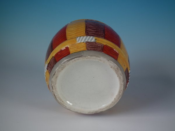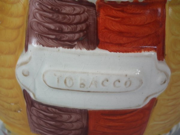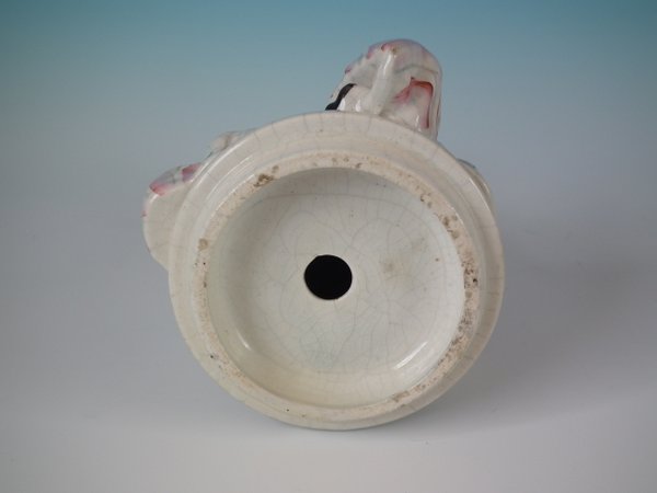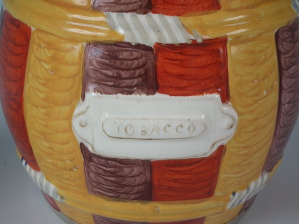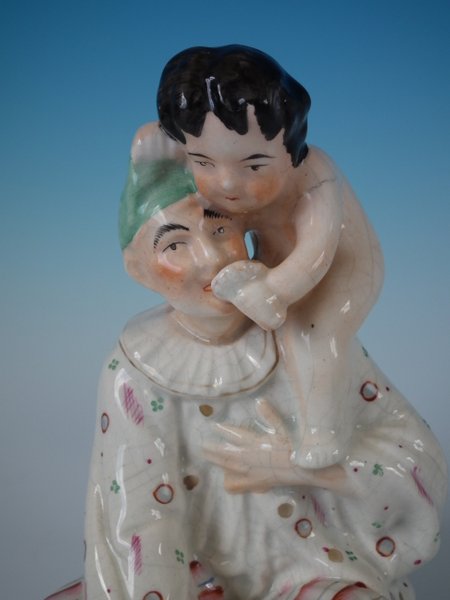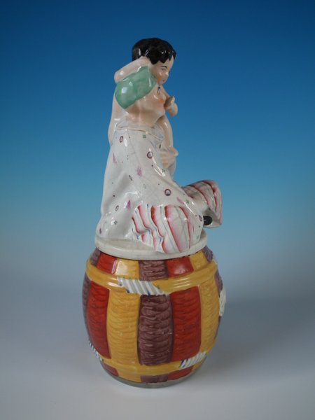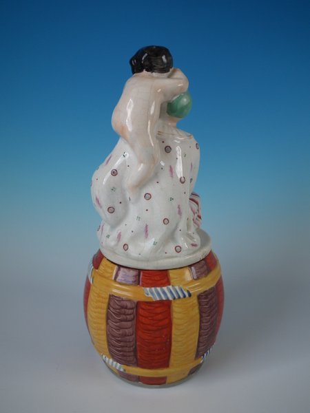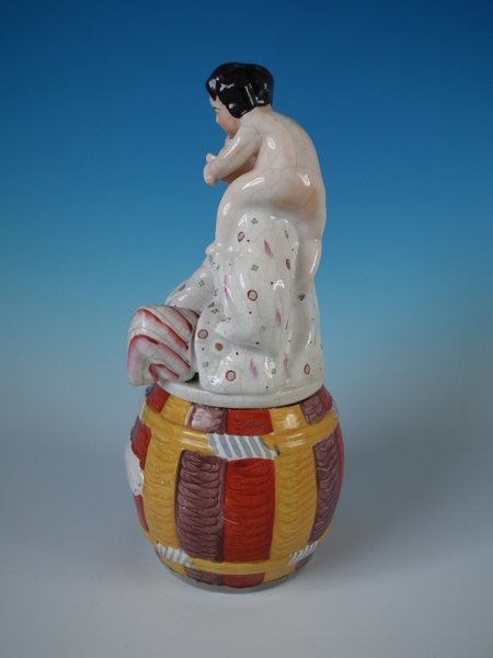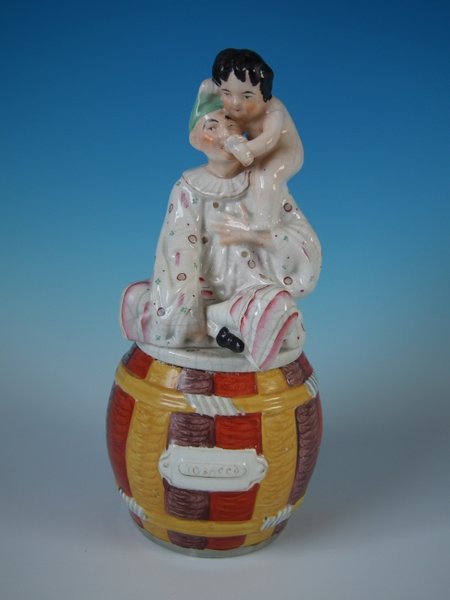 Staffordshire Pottery tobacco jar and cover which features a Pierrot with a Putti