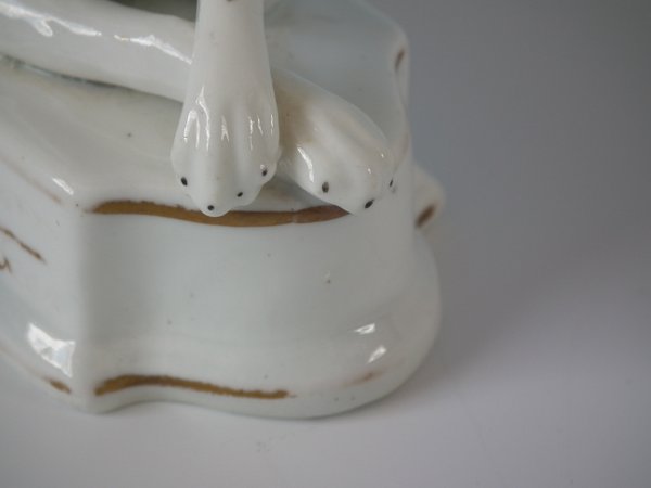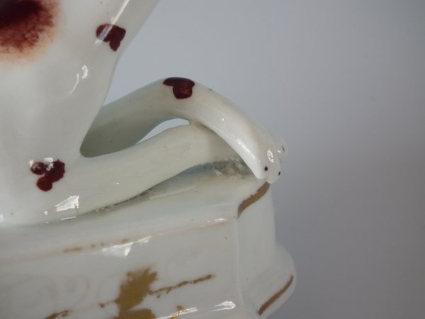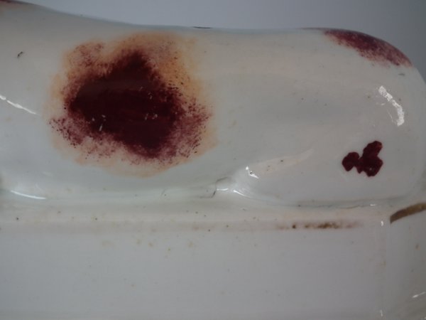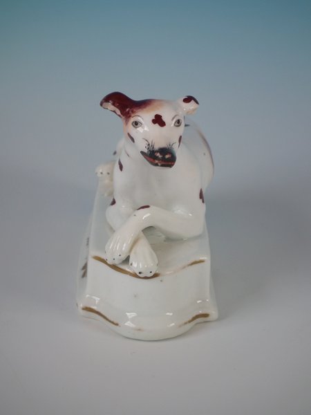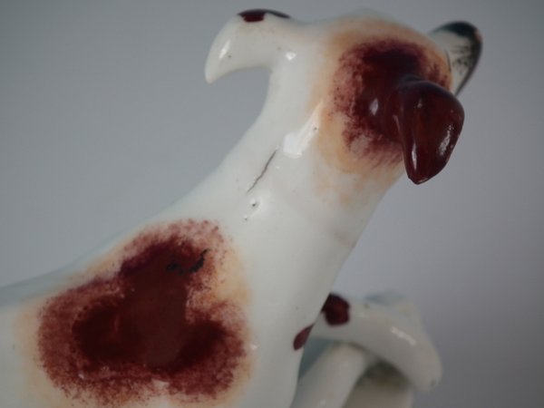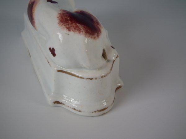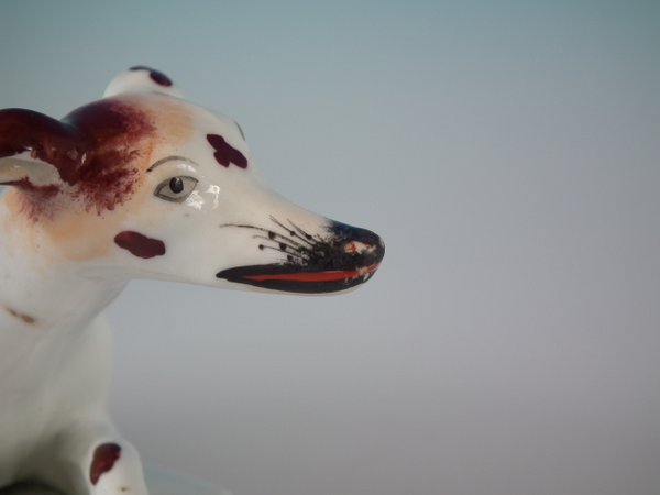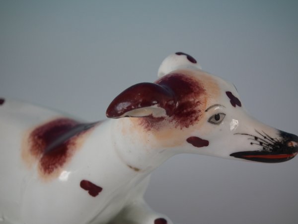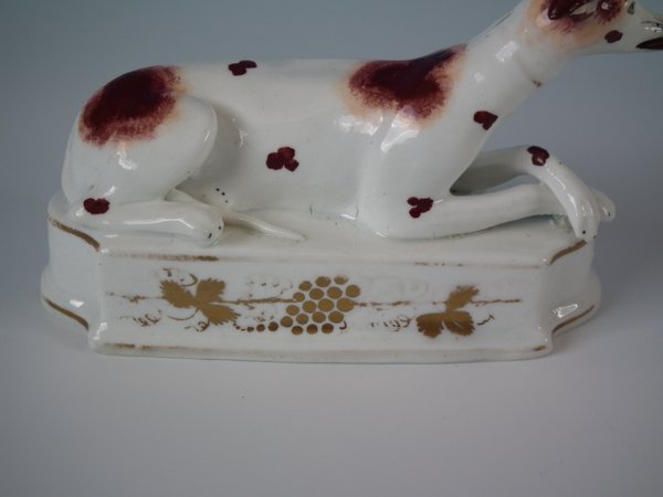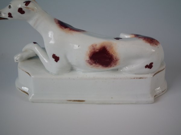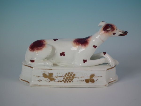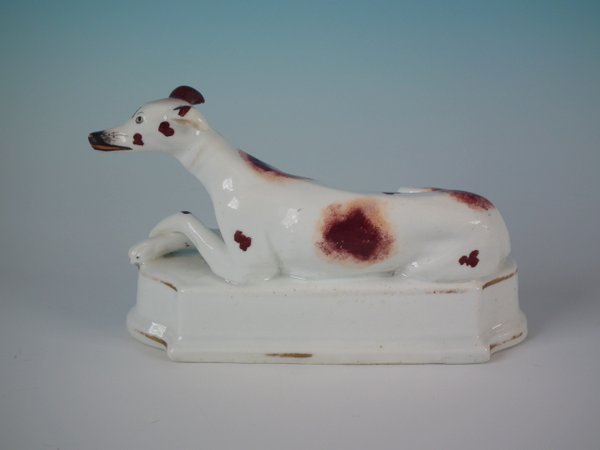 Staffordshire Pottery porcellaneous figure which features a hound, recumbent on a plinth base.