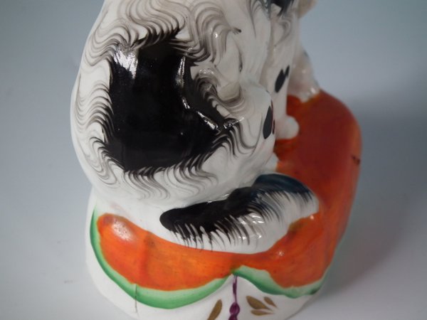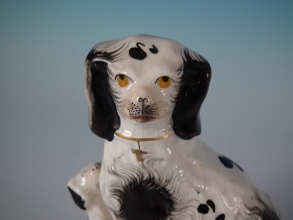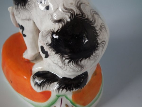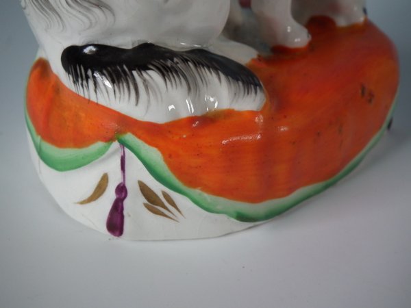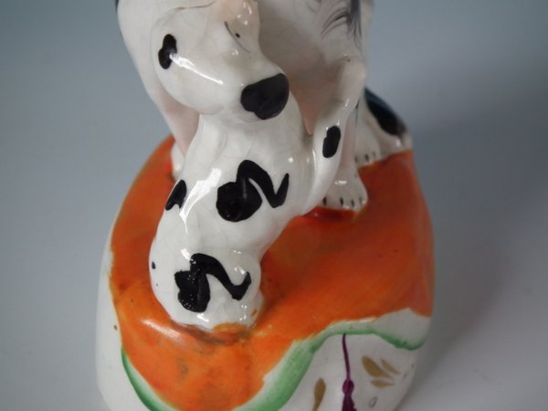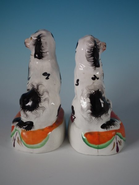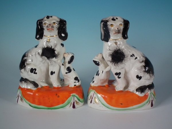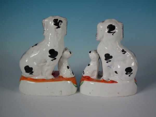 Victorian, circa 1860. Tallest is 6.3ins high, 4.7ins wide, 3.1ins depth. Pair of Staffordshire Pottery groups which feature a spaniel and begging pup, seated on a tasselled cushion base.